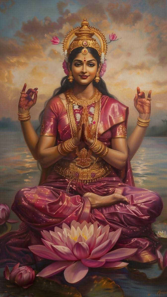 Behold the radiant beauty of Shri Lakshmi, showering blessings upon all devotees! Her gentle hands are poised in the *abhaya mudra*, offering protection and dispelling fear. Draped in a stunning pink sari, adorned with exquisite gold jewelry, and seated upon a divine lotus, she embodies prosperity and grace. May this image fill your heart with *shakti* and bring abundant *darshan* into your life. Let the blessings of the goddess illuminate your path and fill your home with peace. 🙏✨🌸