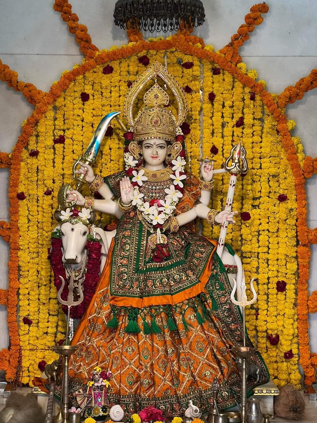 What a captivating sight! Ambe Maa radiates a powerful *shakti* in this stunning depiction. Adorned with a beautiful crown and draped in rich fabrics, the Devi holds her trident and sword, symbols of strength and protection. The vibrant marigold garlands add a touch of auspiciousness, filling your heart with *bhakti*. May her blessings be with you always, bringing peace and prosperity to your life. Make your phone a space for daily *darshan* with this radiant image! πΈπβ¨