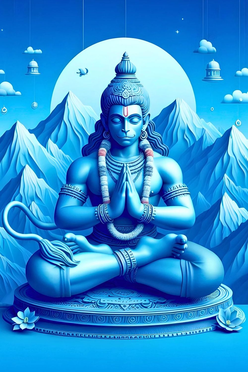 A serene energy radiates from this image of Hanuman, his hands clasped in a gesture of humble devotion. The Pavanputra is captured in deep meditation atop a majestic mountain, bathed in the glow of a celestial blue. The delicate lotus blossoms at his feet and the wisps of cloud around him create a truly peaceful atmosphere. 🙏 May this divine presence fill your phone with bhakti and bring you strength each day. A beautiful reminder of Hanuman\'s unwavering faith and courage! ✨