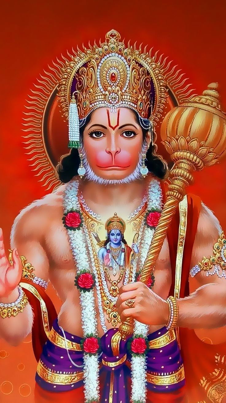 What a glorious darshan of Pavanputra Hanuman! ✨ This image showcases Bajrangbali in all his splendor, radiating bhakti and strength. The intricate details of his jewelry and the gentle flowers adorning his neck speak of devotion and grace. Notice the image of Shri Ram lovingly held within Hanuman\'s chest – a testament to his unwavering faith. Let this wallpaper fill your phone with divine energy and remind you of Hanuman’s unparalleled seva. 🙏 Make your phone a window to the divine and receive blessings daily! 🌸