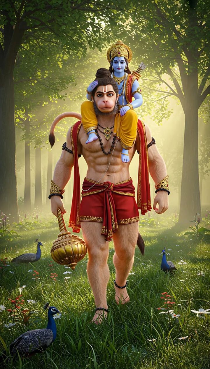 What a sight! Hanuman, the mighty Pavanputra, strides through the emerald forest, carrying Lord Ram and Sita upon his shoulders. The determination in his eyes and the strength in his gait is something to behold! This image is a beautiful depiction of *bhakti* and selfless service. May this powerful image bring you strength and *shakti* in your daily life, reminding you of the unwavering devotion of Bajrangbali. Make your phone a window to daily *darshan*! 🕉️✨🙏