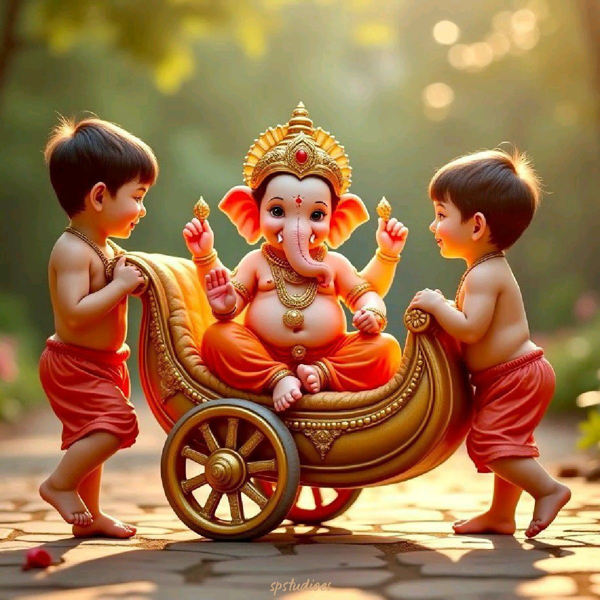 What a heartwarming sight! This image captures the playful *leela* of Bal Ganpati as two adorable children lovingly lift him on his *vahana*. The golden detailing on Ganpati’s crown and the vibrant orange hues create a truly auspicious feeling. You can almost feel the *shakti* radiating from this divine scene! May this image bring you daily *darshan* and fill your life with joy and prosperity. 🐘✨🙏