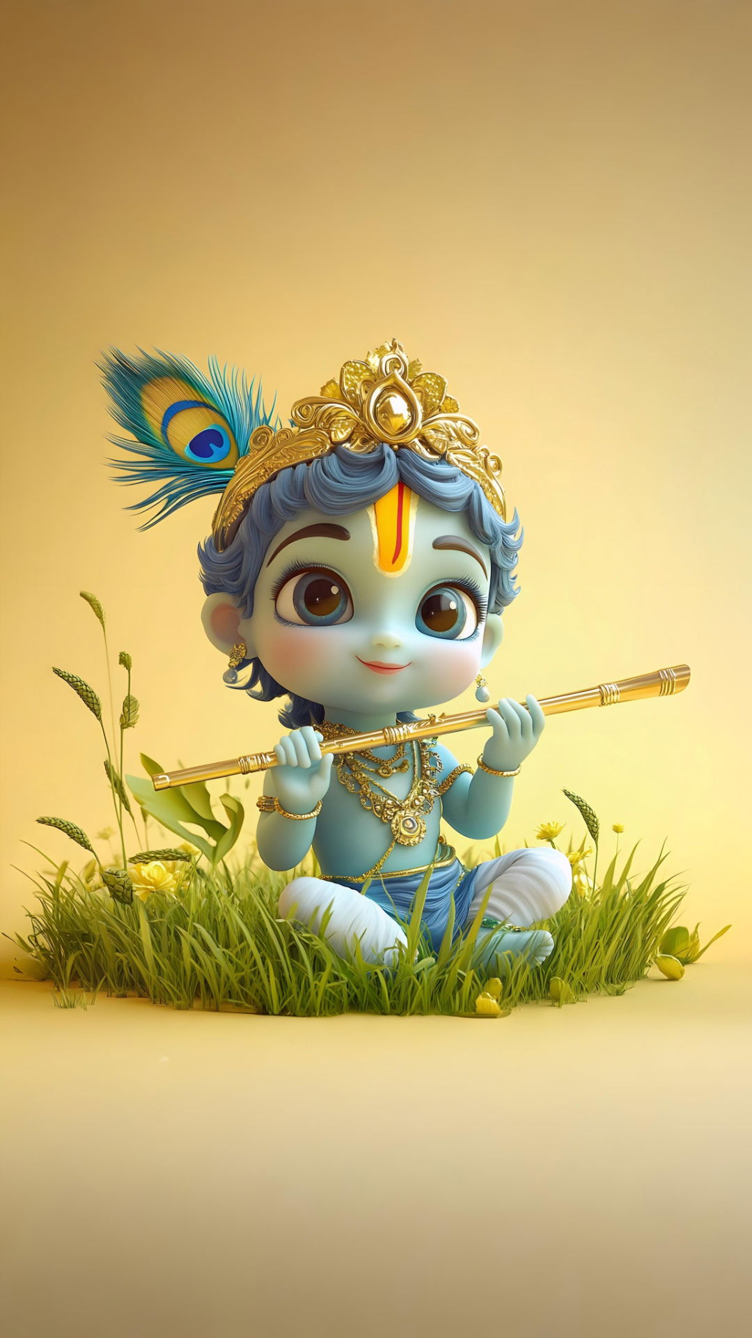 Look at the innocent sparkle in little Kanhaiya\'s eyes as he begins to play his divine flute! This beautiful depiction of Bal Krishna, surrounded by lush greenery, reminds us of his playful *leela* in Vrindavan. It\'s a moment of pure joy and devotion, a gentle reminder to find the music within your own heart. Imagine the sweet melodies drifting on the breeze, filling your day with *bhakti* and bliss! π₯° May this image bring you daily *darshan* and remind you of Krishna\'s boundless love. πΈβ¨π