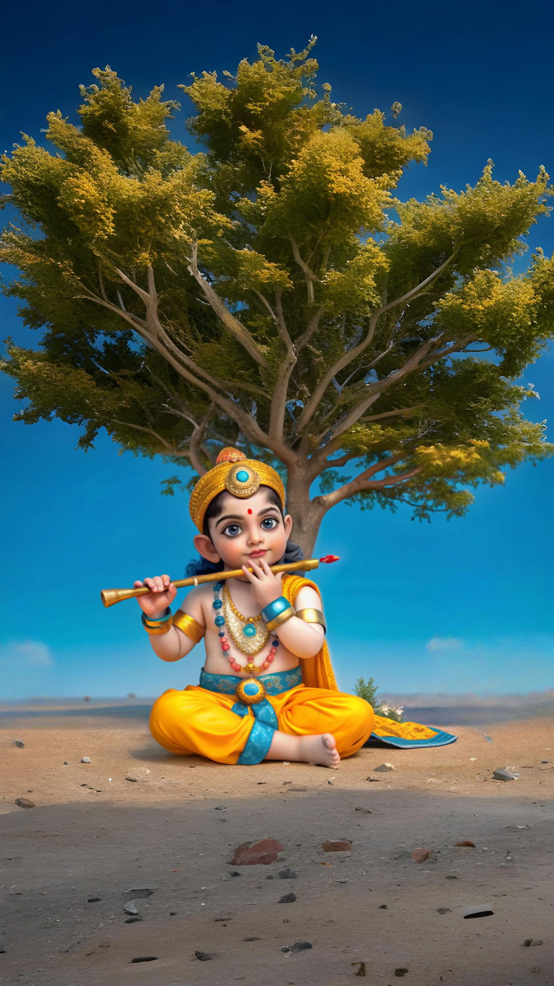 What stories does the gentle curve of Kanhaiya\'s flute tell? This beautiful image captures the innocence and divine joy of Bal Krishna as he sits beneath a golden tree, lost in his music. The soulful melody flowing from his bansuri fills the air with *bhakti*, inviting you to find peace in every note. A perfect reminder to fill your days with divine energy and let the blissful leela of Krishna brighten your spirit. May this darshan bring you joy and serenity! 🕉️💛✨