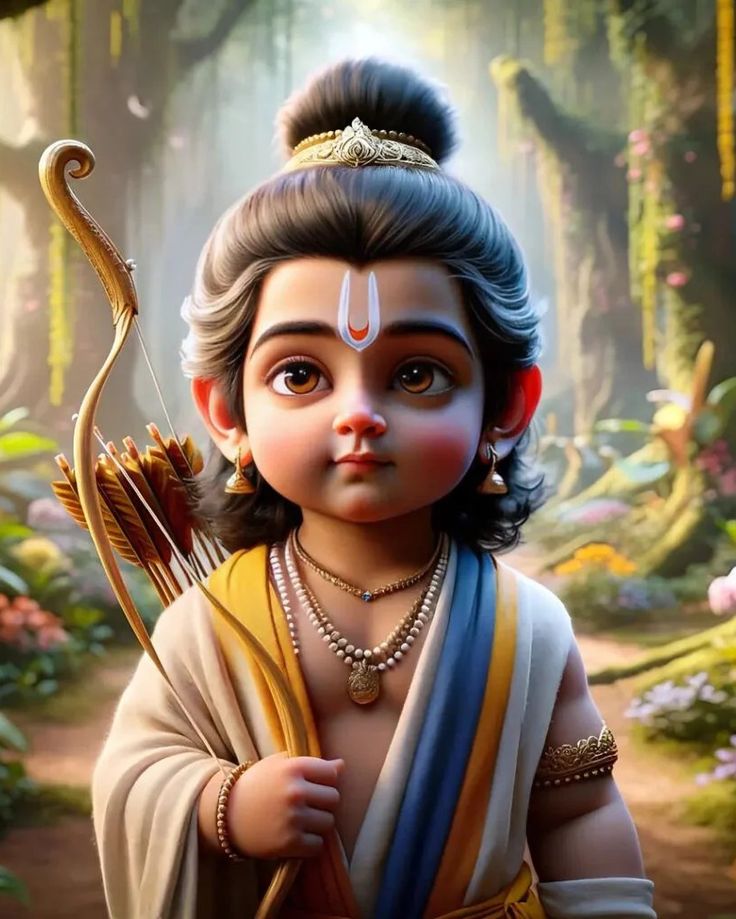 What a captivating sight! Little Ram, with his eyes full of wisdom and dharma, gazes out from the lush forest. The delicate details in this artwork, from the curve of his bow to the tilak on his forehead, truly speak to his divine grace. This image is a beautiful reminder of the strength and innocence of Maryada Purushottam Ram. May this darshan bring peace and blessings to your day. 🕉️✨🙏
