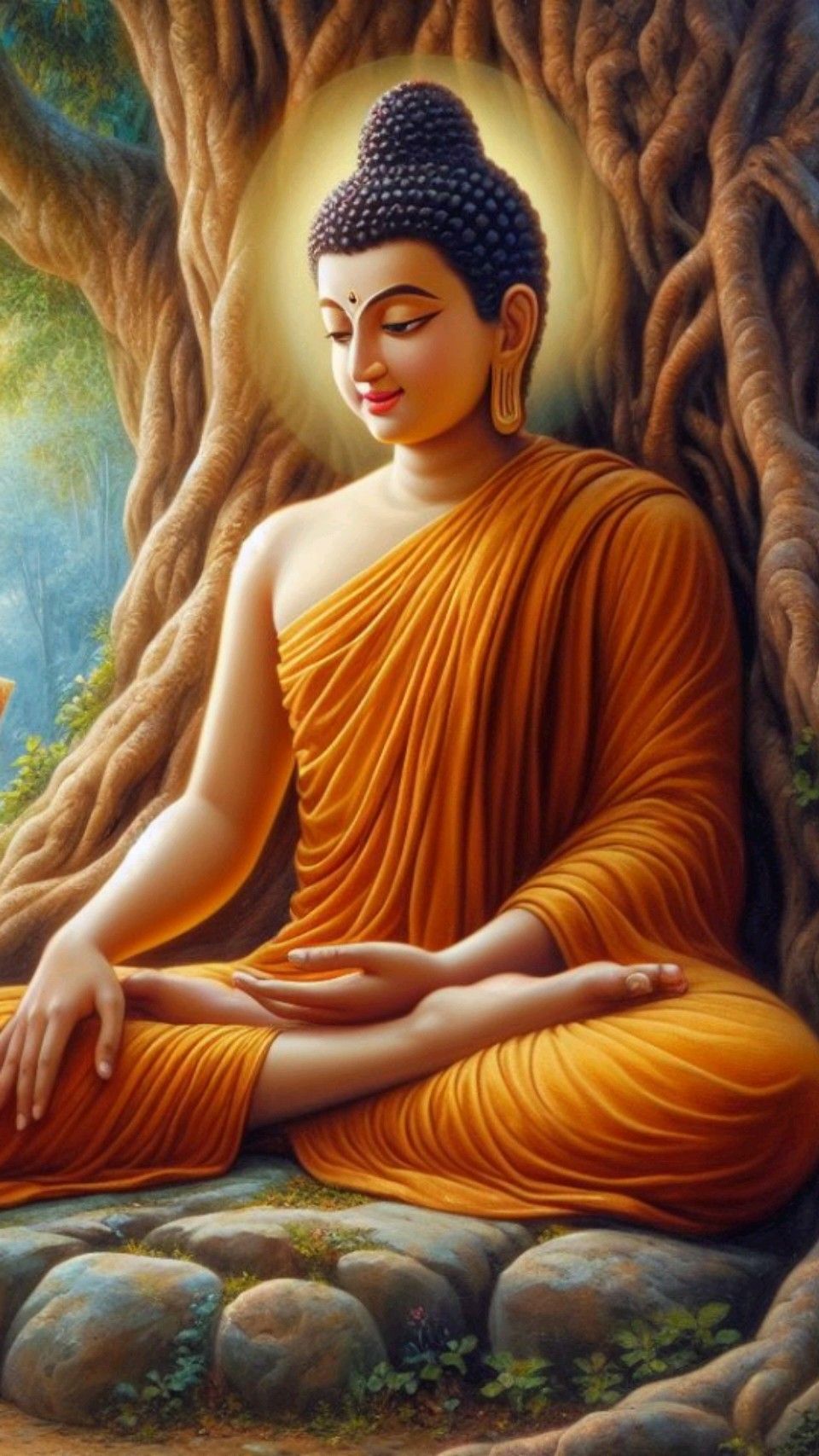 A gentle peace radiates from this beautiful depiction of the Tathagata. Look at the serene expression on the face of the enlightened one, seated in *dhyana mudra* beneath the protective branches of the Bodhi tree. This image is a beautiful reminder to find stillness within yourself and seek inner peace. May it bring *shanti* and blessings to your day, and transform your phone into a gateway for daily *darshan*. 🧘✨🙏