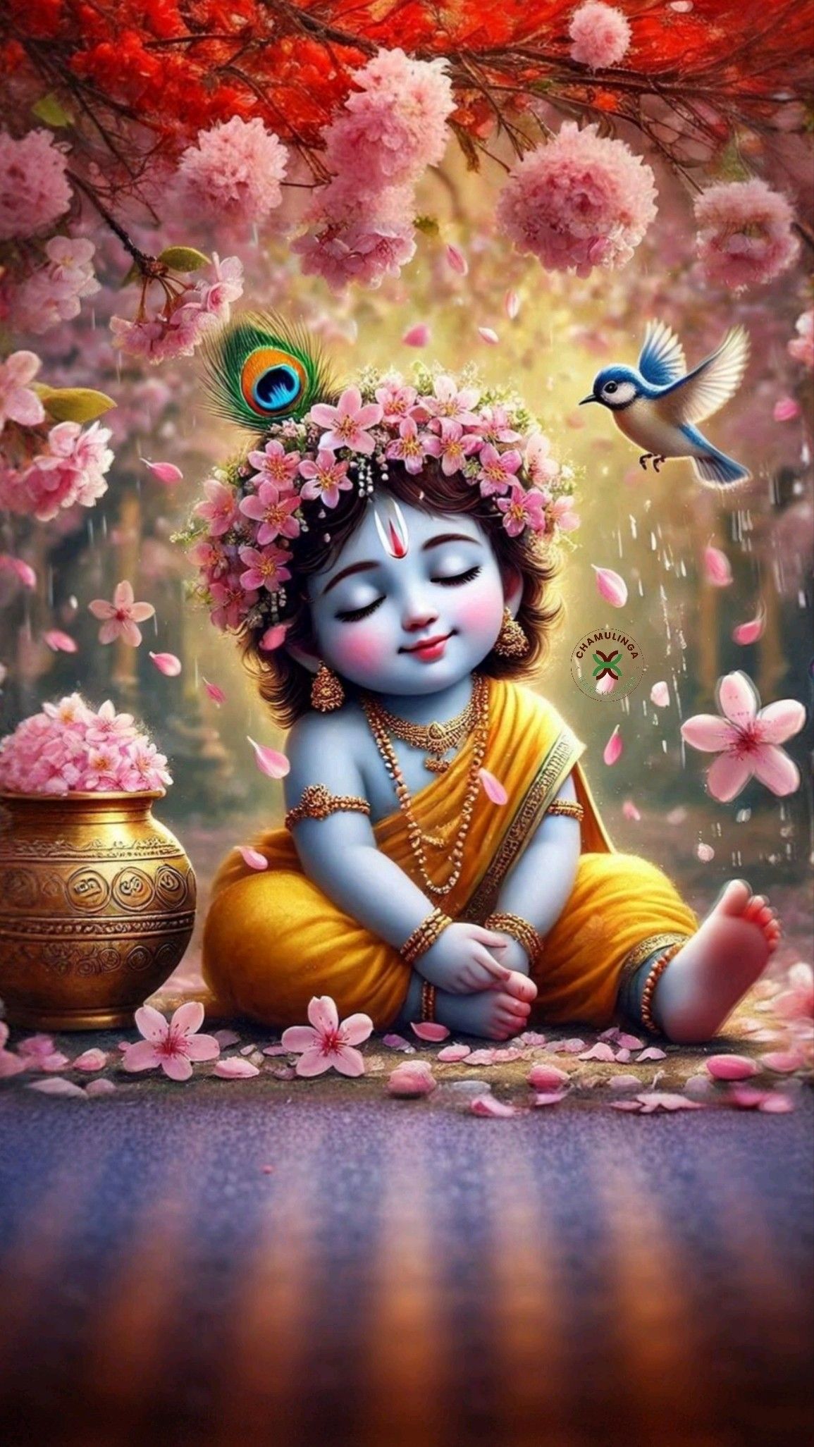 A sense of profound peace emanates from this enchanting image of little Kanha. The gentle curve of his lips and the serene close of his eyes draw you into a world of divine bliss. Surrounded by a cascade of delicate pink petals and adorned with a peacock feather, Murli Manohar seems lost in his own sweet *leela*. May this adorable form of Krishna brighten your day and fill your phone with positive energy! ππΈβ¨ Have *darshan* daily!