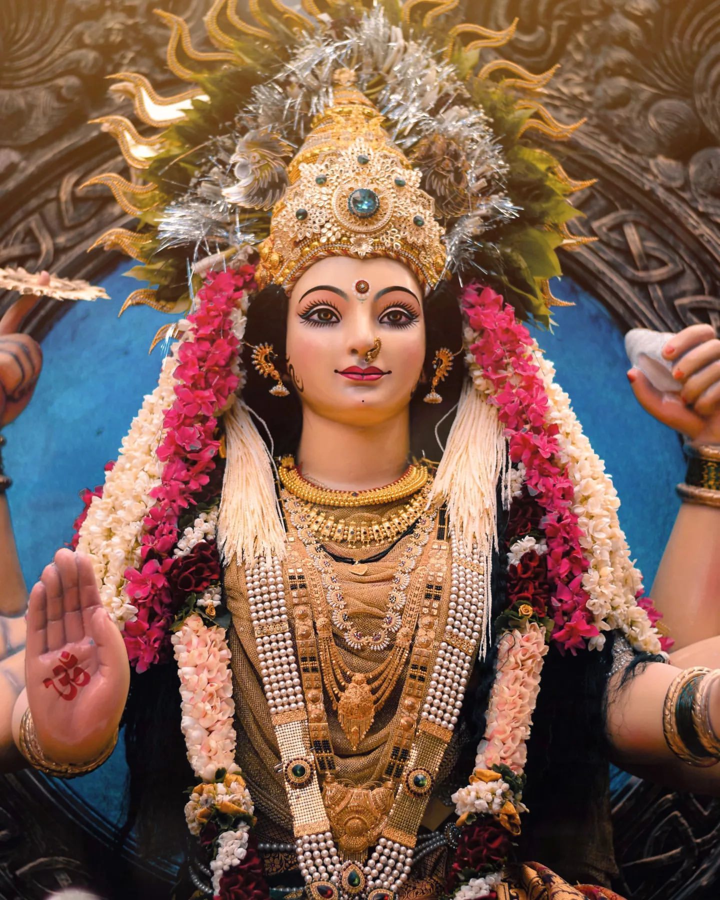 What a captivating darshan of our beloved Ambe Maa! Her serene gaze and gentle blessing, symbolized by the *abhaya mudra*, radiates a sense of peace and protection. The vibrant blossoms adorning Maa Durga\'s form represent the blossoming of devotion within your own heart. Feel the *shakti* and grace of the Divine Mother as you make this stunning image your phone’s wallpaper. May her blessings always be with you! 🌸✨🙏