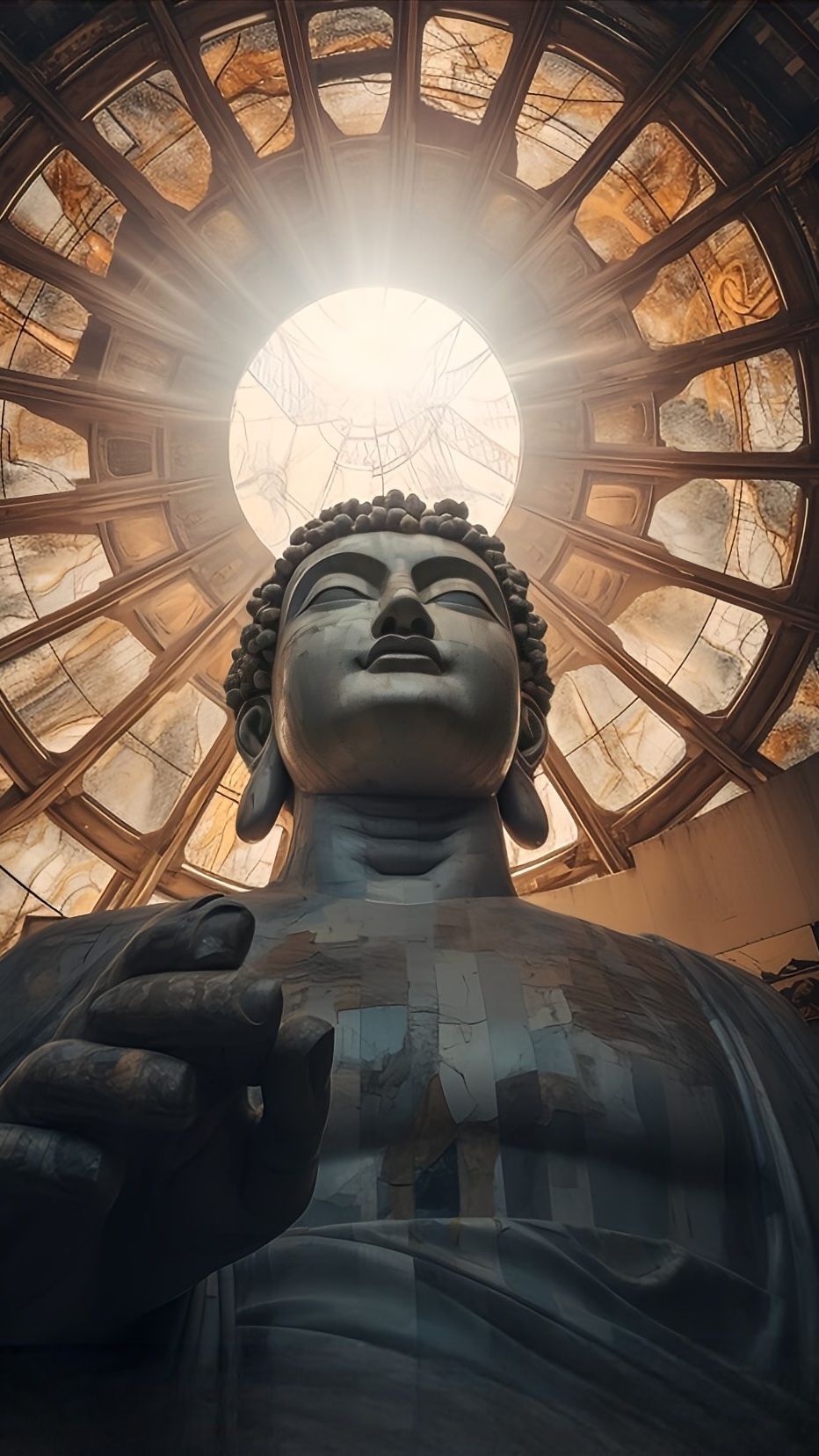 A sense of profound peace emanates from this image of the Tathagata. Bathed in golden light streaming from above, Buddha\'s serene expression invites you to a moment of quiet contemplation. It\'s a reminder to find stillness within, just like Siddhartha Gautama himself did under the Bodhi tree. May this *darshan* bring you clarity and calm. 🙏✨ Let this image become your daily reminder of inner peace. 🧘