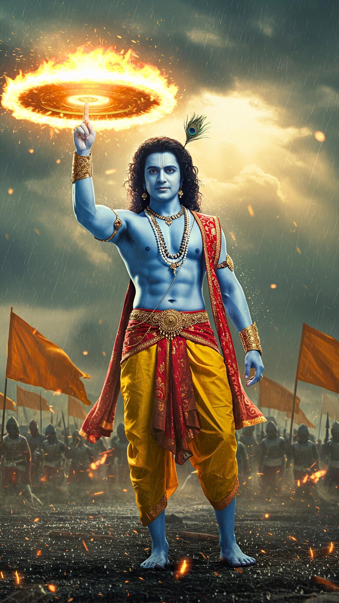 A sense of awe washes over you as you gaze upon this powerful depiction of Kanhaiya! Lord Krishna, with his divine blue complexion, stands resolute amidst a fiery battlefield, holding aloft a swirling chakra like a protective umbrella. The vibrant hues of orange and gold in his attire contrast beautifully with the dramatic storm clouds, symbolizing his unwavering strength and the epic Leela of Kurukshetra. Can you feel the energy of this incredible moment? Let this image fill your phone with Krishna bhakti and bring you *darshan* daily! 🕉️✨🙏