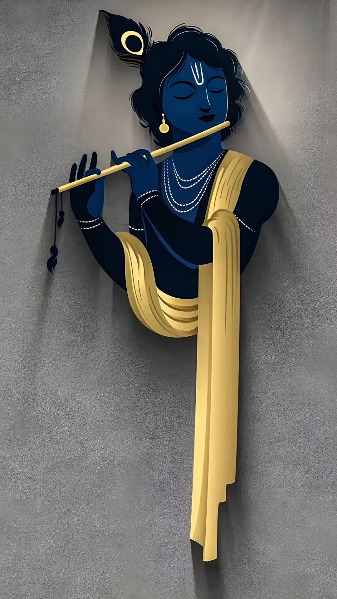 What stories does the gentle curve of Kanhaiya\'s flute tell? This captivating image presents Lord Krishna, the divine flutist, in a stunning digital painting. The deep blues of his skin contrast beautifully with the golden yellow shawl, creating a mesmerizing darshan. Feel the bhakti in every stroke, a reminder of the divine leela that unfolds through music and devotion. Let this image bring the serene energy of Murli Manohar into your daily life.✨🕉️🙏