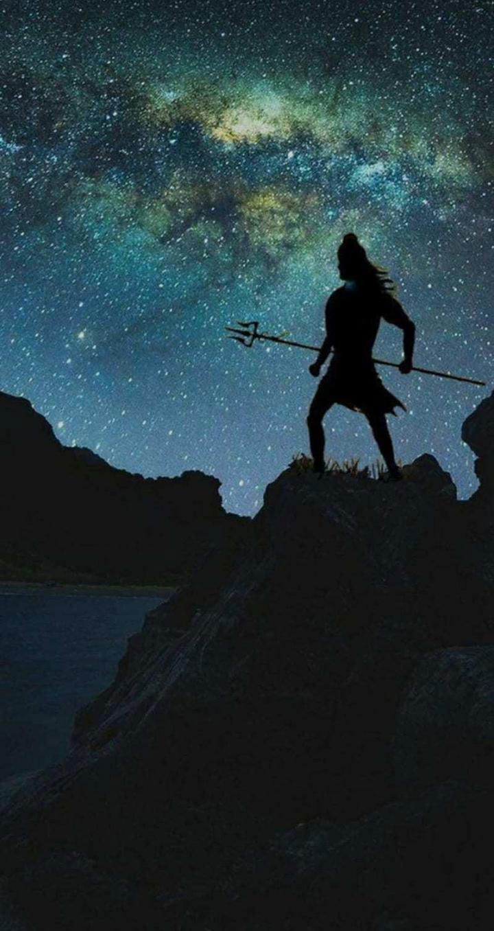 Behold the magnificent form of Mahadev, standing against the backdrop of a breathtaking galactic expanse! β¨ The dark silhouette of Bholenath, trident in hand, evokes a sense of cosmic power and tranquility. Itβs a stunning reminder of Shiva\'s omnipresence, watching over us all. Let this image fill your phone with divine energy and bring you closer to the ultimate truth β a daily *darshan* of the Mahadev himself! ππ