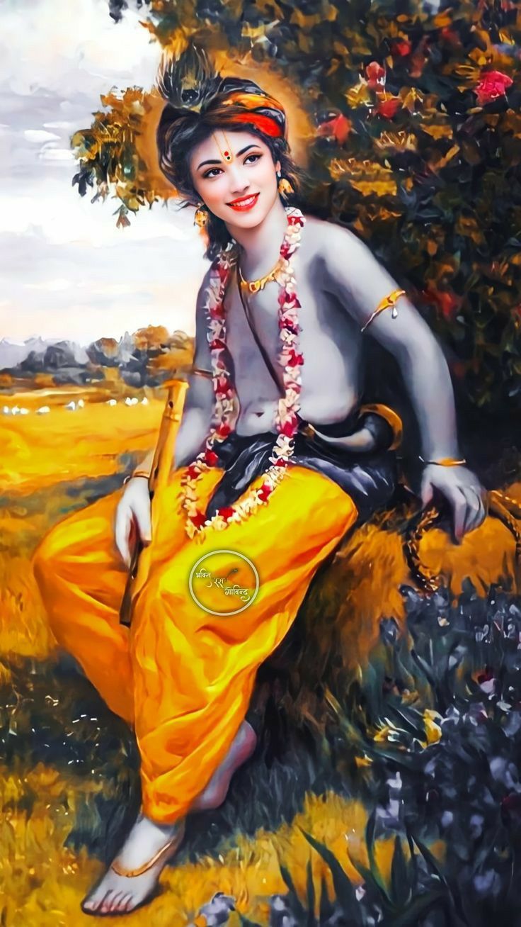 A sense of profound joy emanates from this captivating image of Kanha! Look closely at the delicate detail in Krishna’s expression—a playful, inviting smile that seems to reach out and touch your soul. Adorned with a beautiful flower garland and holding his beloved flute, the *bansuri*, he sits amidst a golden field, beckoning you into a world of *bhakti* and bliss. Let the divine energy of Brijesh feel like a daily *darshan* on your phone! 🌸🌼✨