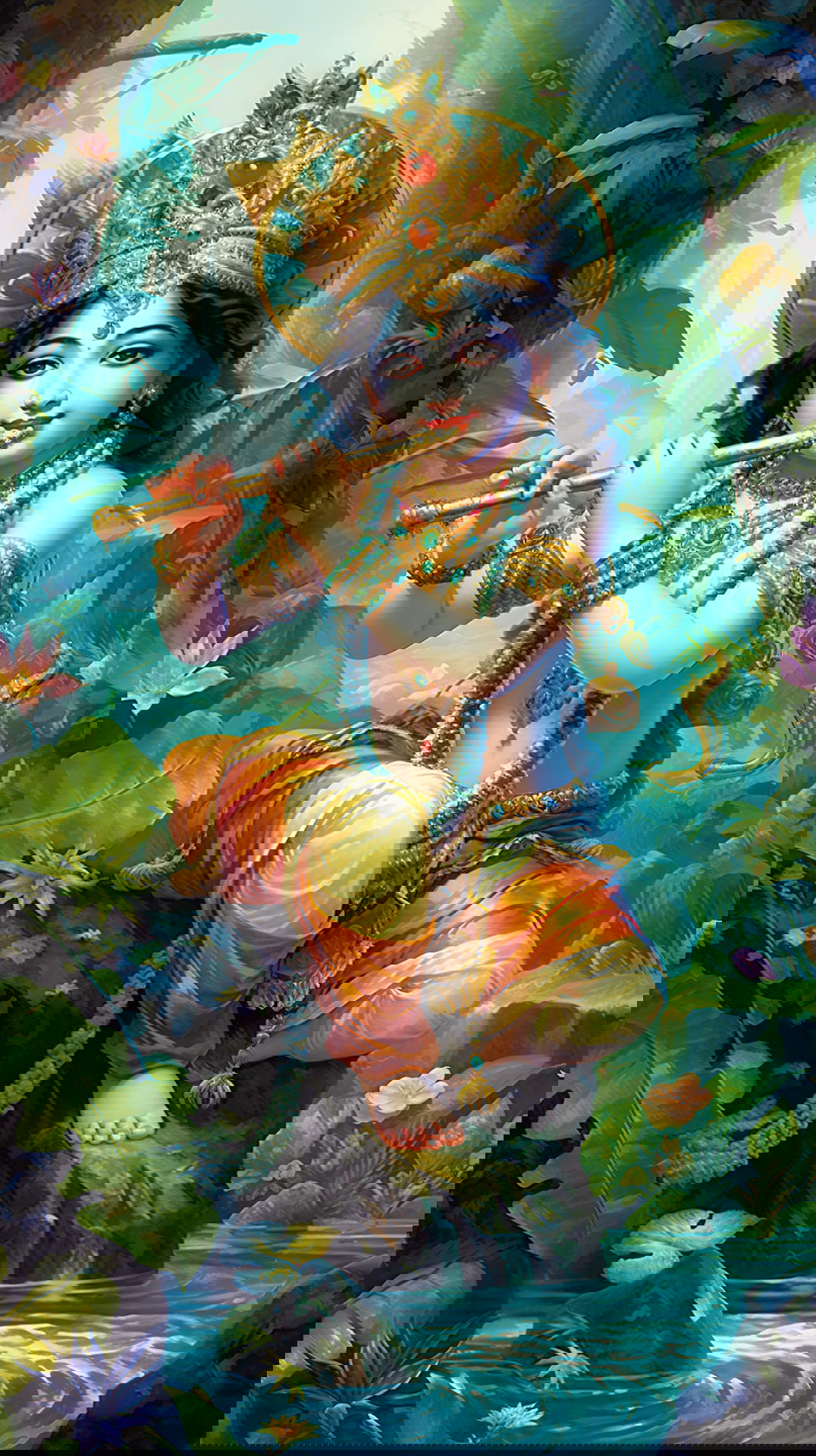 The gentle curve of Krishna\'s flute draws you into a world of divine bliss. Kanhaiya, adorned in emerald jewels and a radiant orange dhoti, sits serenely amidst the lush greenery. His gaze is captivating, filled with the *leela* of Vrindavan. This image reminds us that the music of the soul is always within reach. May this be your daily *darshan*, filling your heart with peace and *bhakti*. 🌿🎶✨