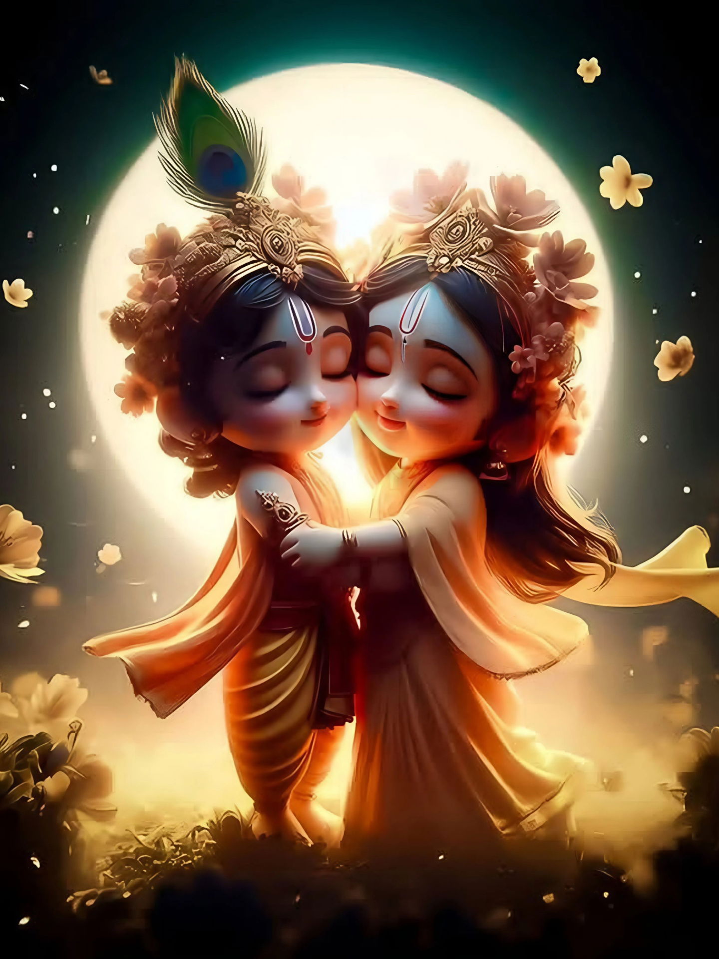 What a sweet *leela* unfolds before your eyes! This image captures a tender moment between the divine couple, Radha Krishna, bathed in the gentle glow of the moon. You can almost feel the blissful energy radiating from their embrace – a perfect reminder of *prema* and devotion. Bal Krishna’s adorable form and Radha’s radiant smile are simply captivating, aren’t they? Let this heartwarming scene be your daily dose of *darshan* and fill your phone with divine vibes!🌸✨🙏