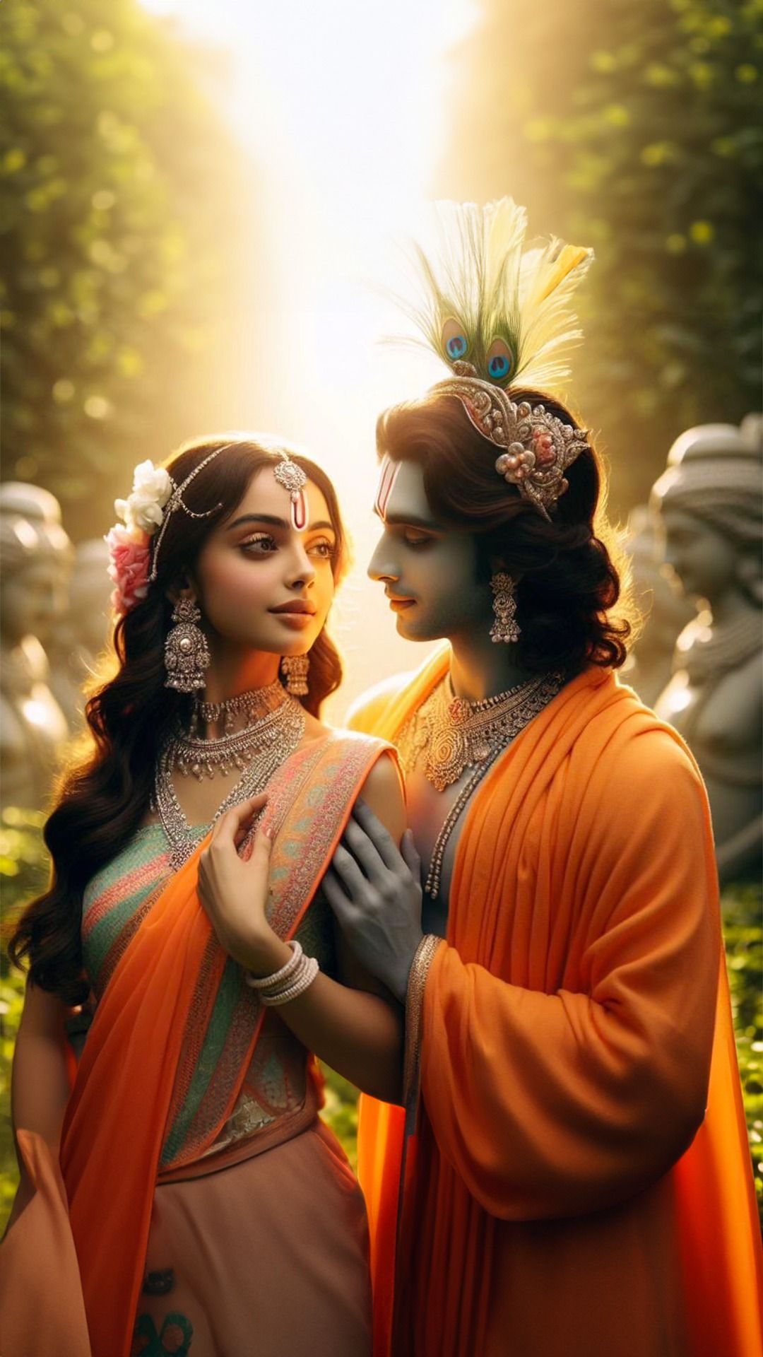 A sense of profound peace emanates from this image as Kanhaiya gazes lovingly at Radha. The delicate floral ornaments and rich orange hues evoke the divine *leela* of Vrindavan. The gentle touch and the peacock feather in Krishna’s hair—a symbol of his playful nature—invite you into a realm of devotion and eternal love. May this *darshan* fill your days with blessings and serenity. 🌸🙏✨
