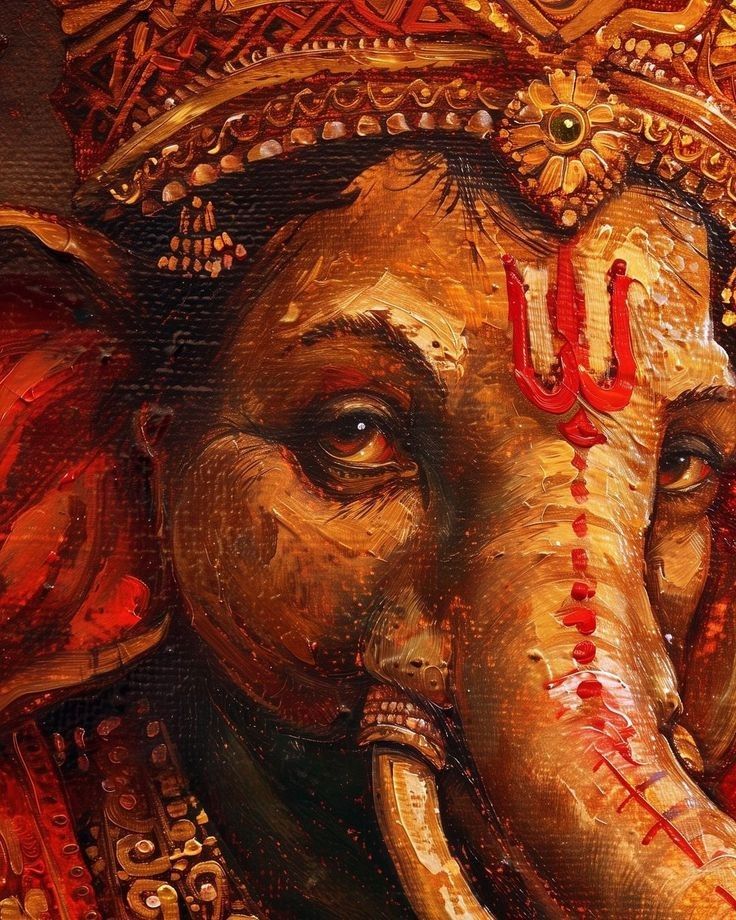 A sense of profound peace emanates from this stunning close-up of Lord Ganesha. Look into his eyes, and you can almost feel the wisdom of ages! The artist’s use of warm oranges and golds brings out the divine *shakti* within the beloved Vighnaharta. May his blessings always be with you and your family, bringing *darshan* into your everyday life. 🕉️✨🙏