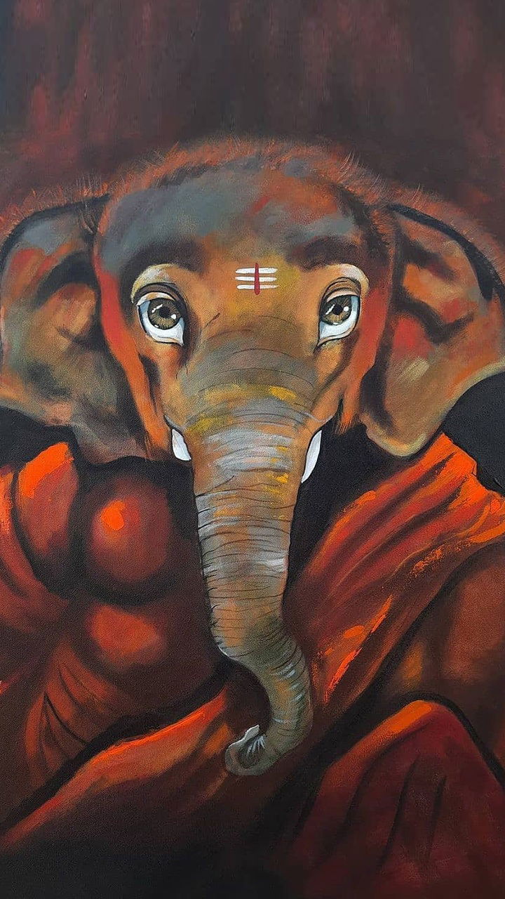 What stories do those kind eyes of Gajanana hold? ✨ This beautiful painting captures the gentle essence of Lord Ganesha, the remover of obstacles and the deity of wisdom. His trunk, adorned with subtle hues, seems to offer a silent blessing. May this image bring *shakti* and good fortune into your life. Let the energy of Ekdantaya fill your phone with divine *darshan* every day! 🕉️🙏