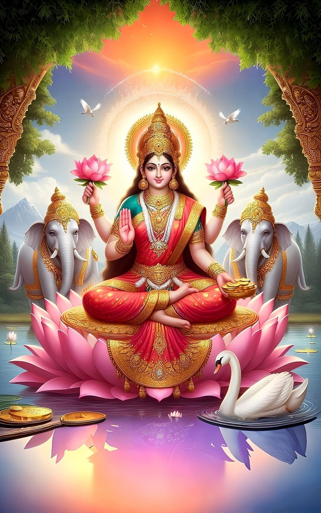 What stories does the gentle radiance of Shri Lakshmi Maa tell? This beautiful depiction shows the Goddess of wealth and prosperity, seated gracefully upon a magnificent pink lotus. Surrounded by elephants showering her with blessings, and serene swans gliding on the water, the scene evokes a sense of abundant fortune and divine grace. May your home be filled with the blessings of Lakshmi Devi and her eternal *shakti*. Make your phone a source of daily *darshan*! πΈππ¦’β¨