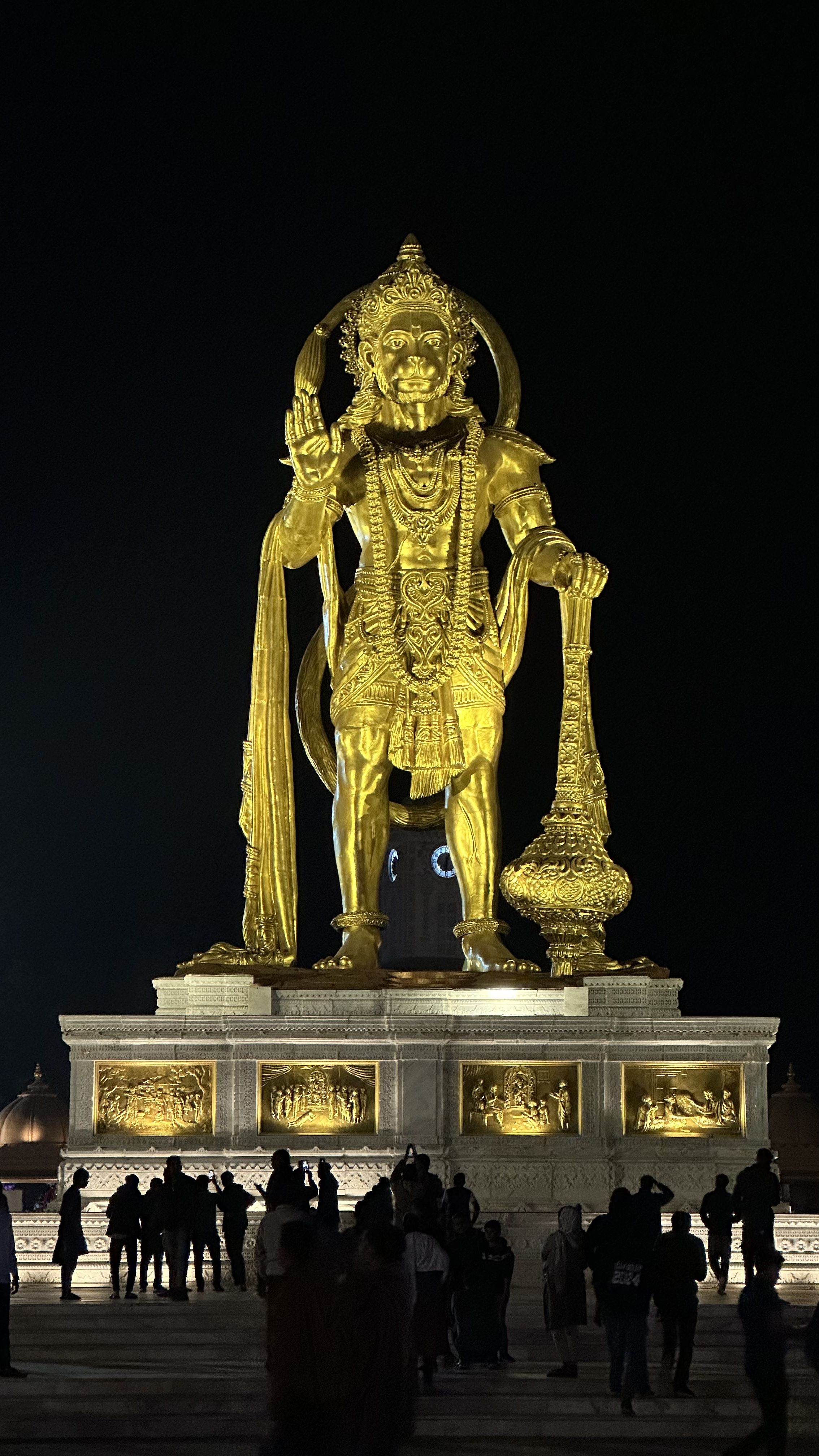 Behold the majestic presence of Hanuman, radiating golden light against the night sky! This captivating image captures the awe-inspiring statue of Pavanputra, a beacon of devotion and strength. You can almost feel the bhakti and shakti emanating from this sacred space. This darshan of Bajrangbali is a reminder of courage, loyalty, and selfless service. Make your phone a window to the divine, bringing the blessings of Hanuman into your everyday life! 🕉️✨🙏