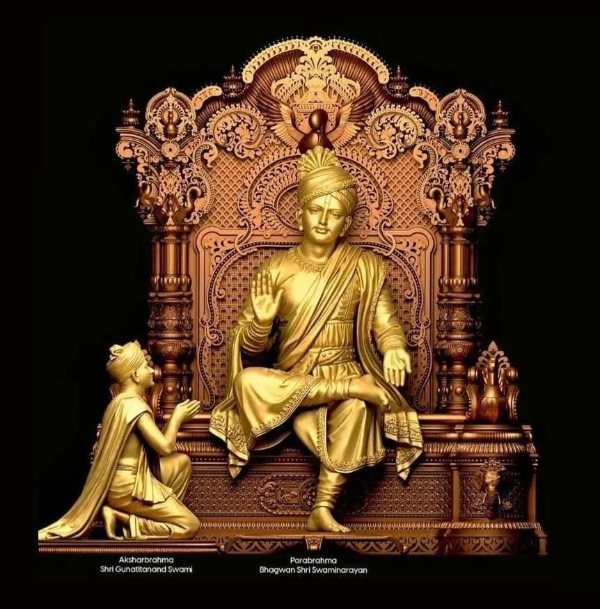 What a stunning darshan of Swaminarayan Bhagwan! The image depicts Shri Swaminarayan seated majestically on a beautifully ornate golden throne, radiating peace and divine energy. A devoted disciple kneels in reverence at his feet, illustrating the profound bhakti felt by devotees. The intricate gold embroidery and regal attire only amplify the Bhagwan\'s grandeur. ✨Let this image fill your day with blessings and remind you of the divine light within. May Swaminarayan\'s grace shower upon you and your loved ones. Make your phone a source of daily darshan! 🕉️🙏