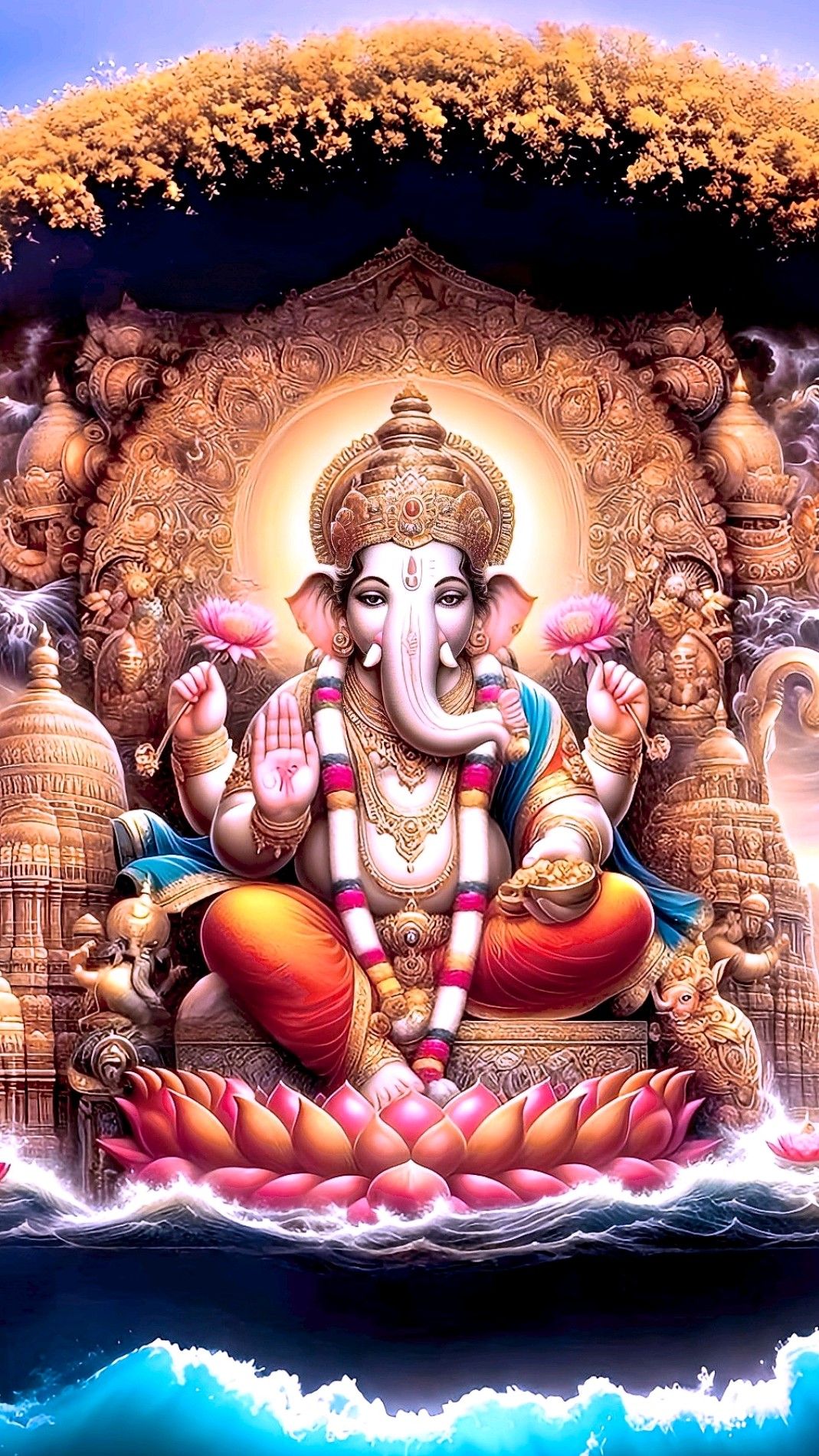 What stories does the ornate detail of this beautiful Ganpati idol tell? ✨ Behold the splendor of Shri Ganesha, seated majestically upon a lotus, radiating blessings and wisdom. This image is a testament to the power and grace of the remover of obstacles, Vighnaharta. Feel the divine shakti in every curve and detail. May this beautiful darshan bring you peace and prosperity. 🕉️ Make your phone a source of daily devotion with this stunning wallpaper! 🙏