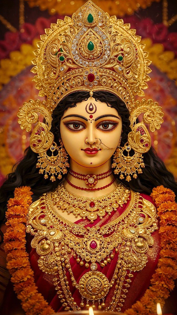 What stories do those captivating eyes tell? This mesmerizing portrait of Maa Durga, radiating *shakti* and grace, is a true feast for the soul. The intricate golden jewelry and vibrant saffron hues create a divine aura, bringing the blessings of the Mother Goddess right to your fingertips. May this image bring you peace and prosperity, reminding you of the power within. Make your phone a window to daily *darshan*! πΈβ¨π