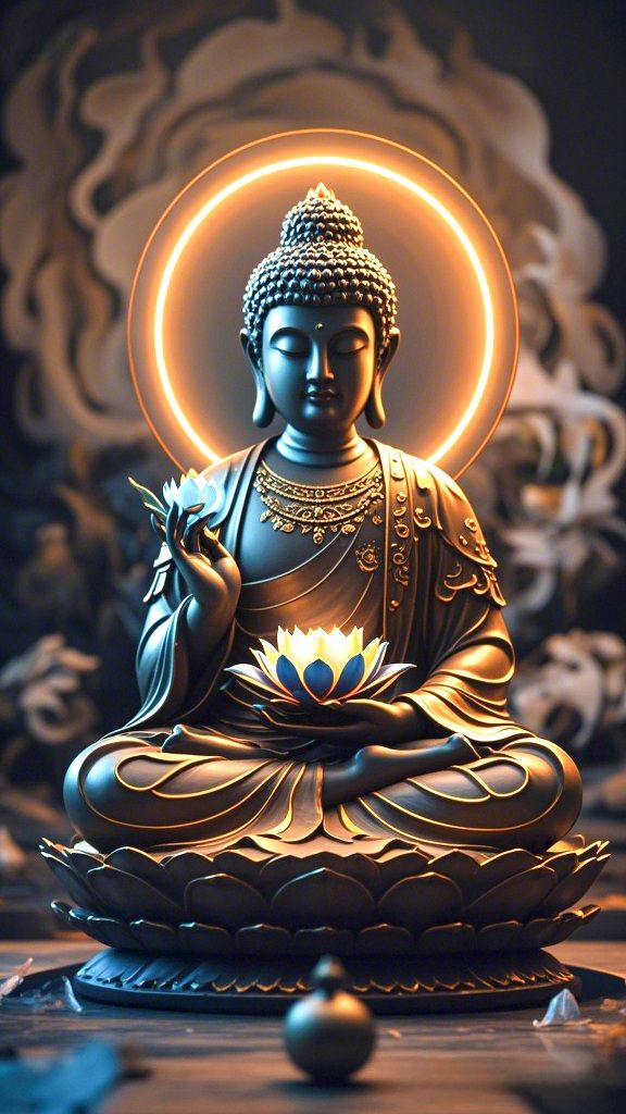 A sense of profound peace emanates from this image of the Tathagata, radiating a golden aura that speaks to his enlightened state. Look closely at the intricate details of his form, the delicate lotus upon which he sits, and the gentle curve of his lips. May this *darshan* bring you inner stillness and a reminder of your own potential for awakening. Make your phone a source of daily calm and *shanti* with this beautiful image. 🙏✨🧘