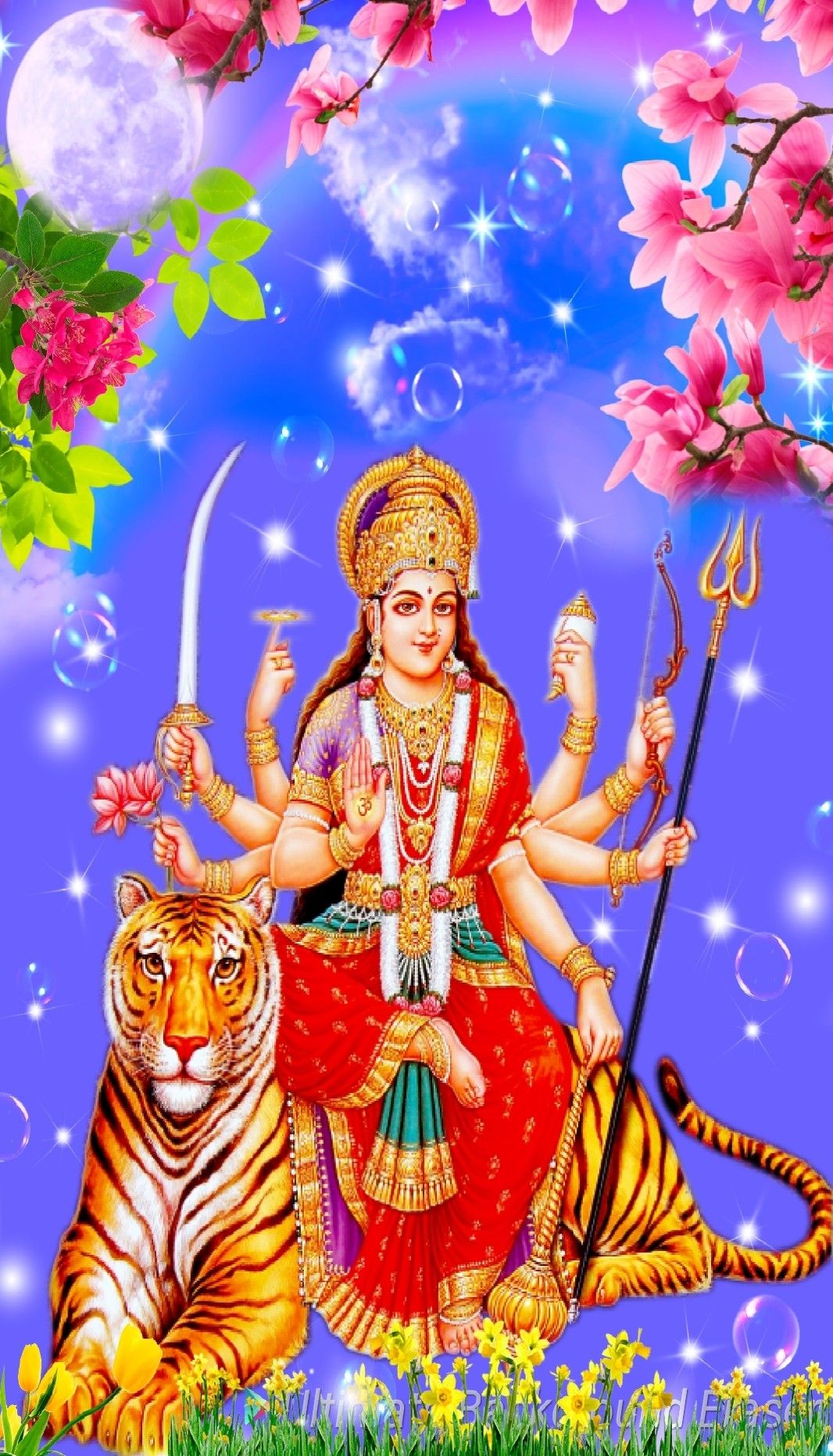A sense of profound *shakti* emanates from this beautiful depiction of Ma Durga, seated majestically upon her loyal tiger. Look closely at the intricate details of her crown and the gentle expression on her face, offering blessings to all who seek her *darshan*. Her many arms symbolize her power to protect and her readiness to vanquish evil. May this image fill your phone with positive energy and remind you of the Divine Mother\'s unwavering grace. πΈβ¨π Make your phone a source of daily inspiration with the blessings of Ambe Maa!