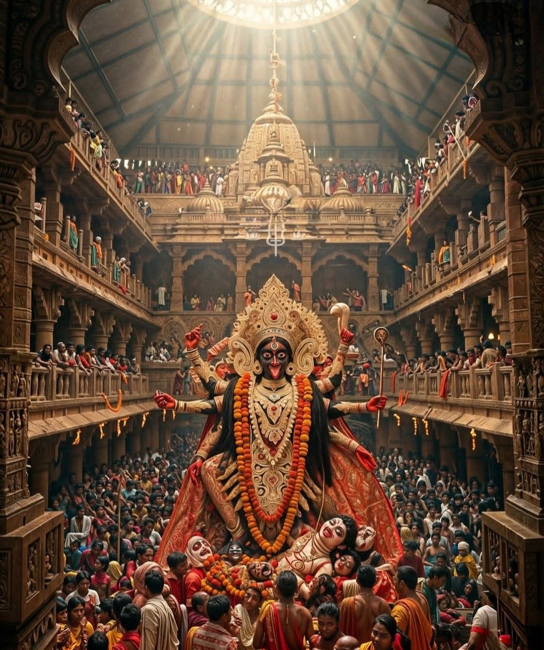 Behold the magnificent presence of Maa Kali as she ascends in all her glory! ✨ The air thrums with *shakti* as devotees gather, their faces illuminated by the divine light. This breathtaking image captures the raw power and fierce compassion of the Goddess. It\'s a moment of true *darshan*, a glimpse into the heart of the Divine Mother. May her blessings flow into your life and fill your phone with positive energy. 🕉️🙏 Make your phone a canvas for daily spiritual connection and receive Maa Kali’s protection.