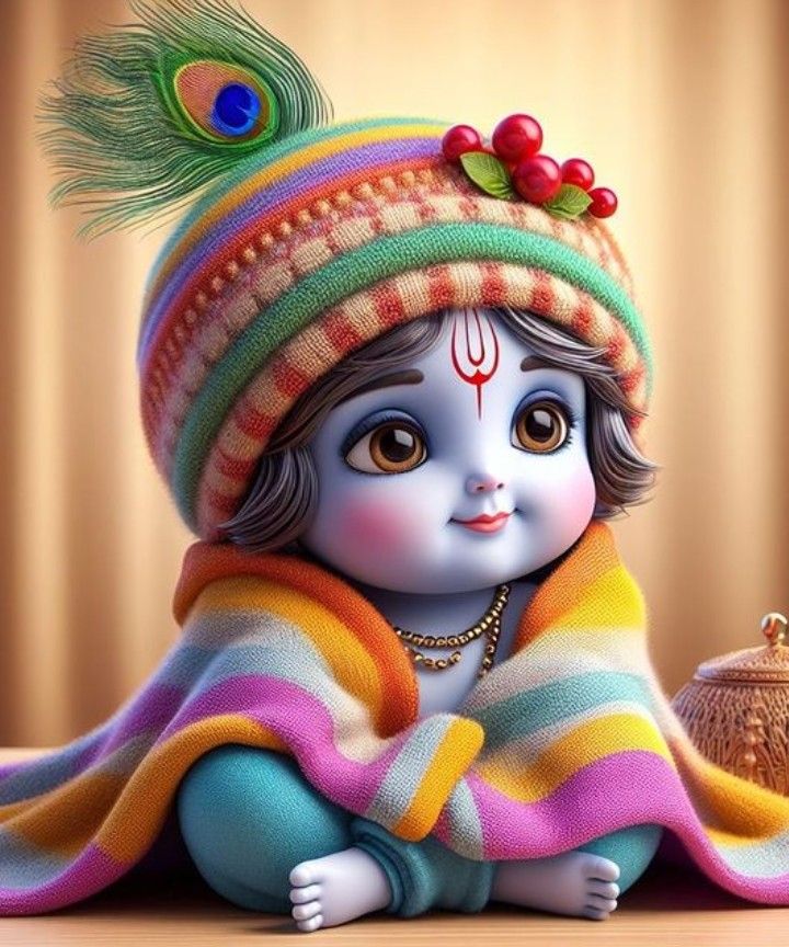 What a delightful sight! Little Kanha, looking utterly adorable in a brightly colored, hand-knit cap, captures your heart with those innocent eyes. The playful glint in his eyes and the delicate peacock feather adorning his head remind us of the divine *leela* of Shri Krishna. This image brings a wave of *bhakti* and a gentle joy to your soul. Let Bal Gopal grace your phone and fill your day with sweetness and blessings! 🕉️✨💖