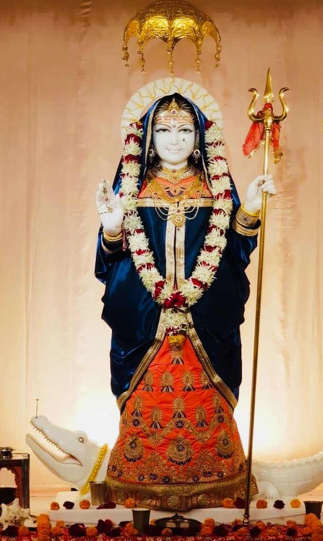 A sense of profound peace emanates from this beautiful image of Khodiyar Maa. Her gentle gaze and the intricate details of her attire – the vibrant sari and delicate floral garland – draw you in. The presence of the *trishul* and the crocodile imagery speaks to her power and protection. May this *darshan* fill your life with blessings and strength. 🙏🌸 It\'s a reminder of the divine *shakti* that resides within us all. 🥰 Keep this image on your phone for daily blessings! ✨