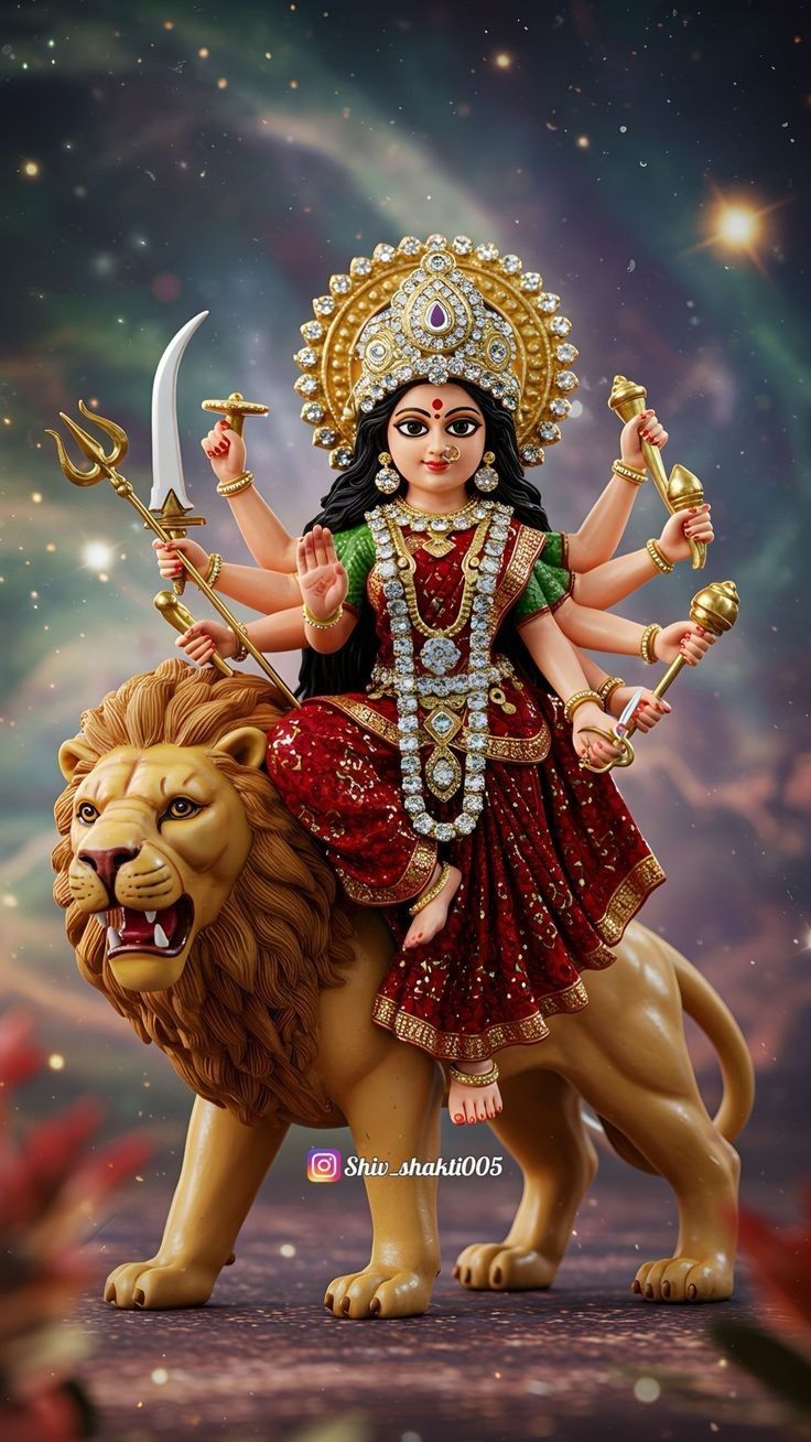 What a magnificent sight! Ambe Maa, radiant and powerful, sits regally atop her majestic lion, her presence filling the frame with *shakti*. The intricate details of her jewelry and vibrant red sari draw the eye, while the gentle curve of her hand holding the *trishul* speaks of her strength and protection. May this image bring blessings and peace to your phone, turning every glance into a moment of *darshan*. 🕉️🙏✨
