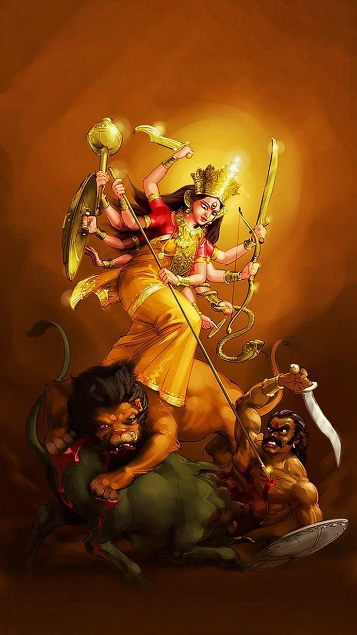 What stories of courage and shakti does this image whisper? Witness the magnificent Durga Maa, astride her loyal lion, a symbol of power and protection. Her ten arms wield weapons to vanquish evil, offering *darshan* of her divine strength. The vibrant hues and intense gaze evoke a feeling of profound reverence, reminding you of the goddess’s unending battle against darkness. Let this image be a daily source of inspiration, a reminder of the *shakti* within you. 🕉️✨🙏