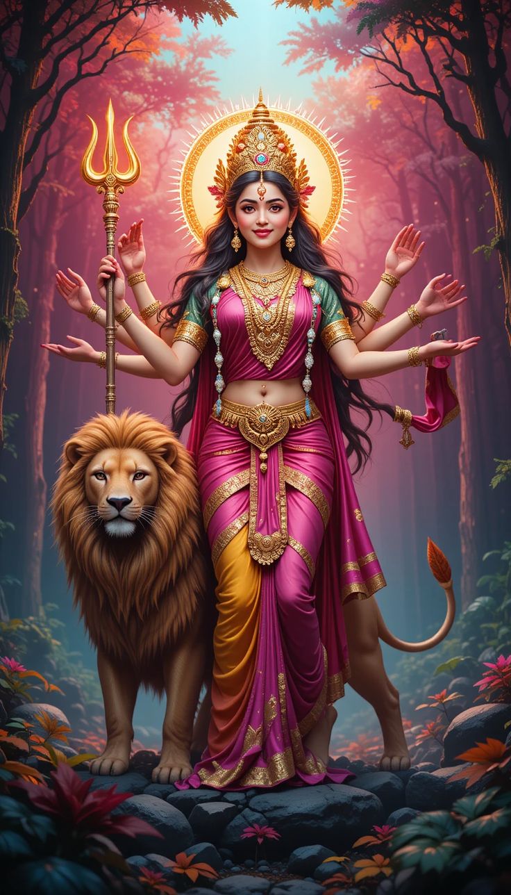 What a mesmerizing sight! Ambe Maa, radiant and powerful, stands amidst a lush forest, her presence commanding respect and devotion. The divine Mother, adorned in a beautiful pink and orange sari, exudes *shakti* and grace. Her multiple arms symbolize her boundless ability to protect her devotees. With a trident in hand and a majestic lion by her side, she is the embodiment of courage and strength. May this image bring a sense of peace and *bhakti* into your life. Make your phone a portal to daily *darshan* with this divine wallpaper! ✨🙏🕉️