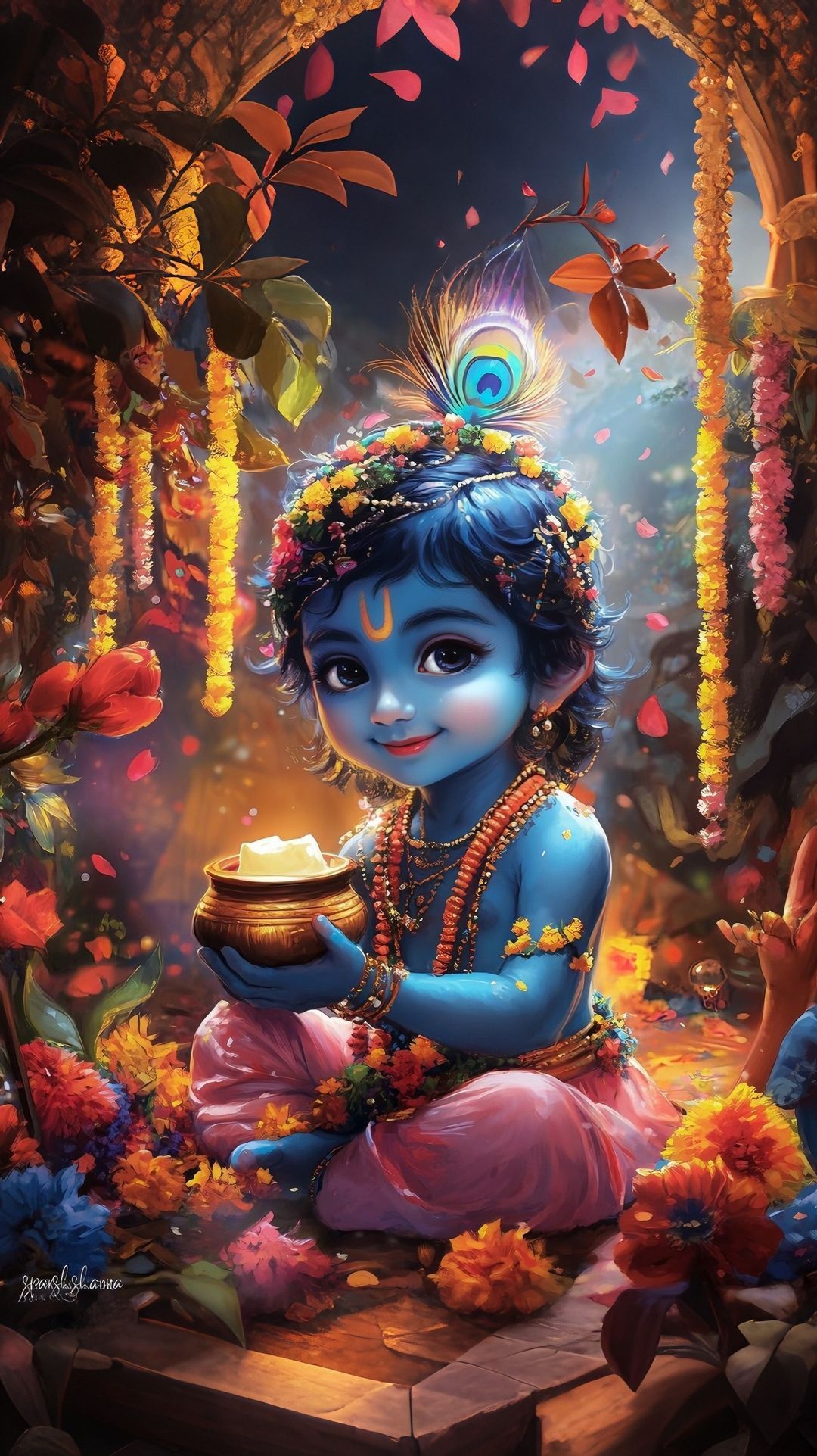A sense of joyful innocence radiates from this captivating image of Bal Krishna! Look at the mischievous sparkle in little Kanhaiya\'s eyes as he holds a pot brimming with creamy *makhan*! Surrounded by vibrant blooms and adorned with a delicate peacock feather, this depiction captures the playful *leela* of the divine child. May this delightful *darshan* brighten your day and fill your heart with *bhakti*. πΈπβ¨ Make your phone a window to the divine, everyday!