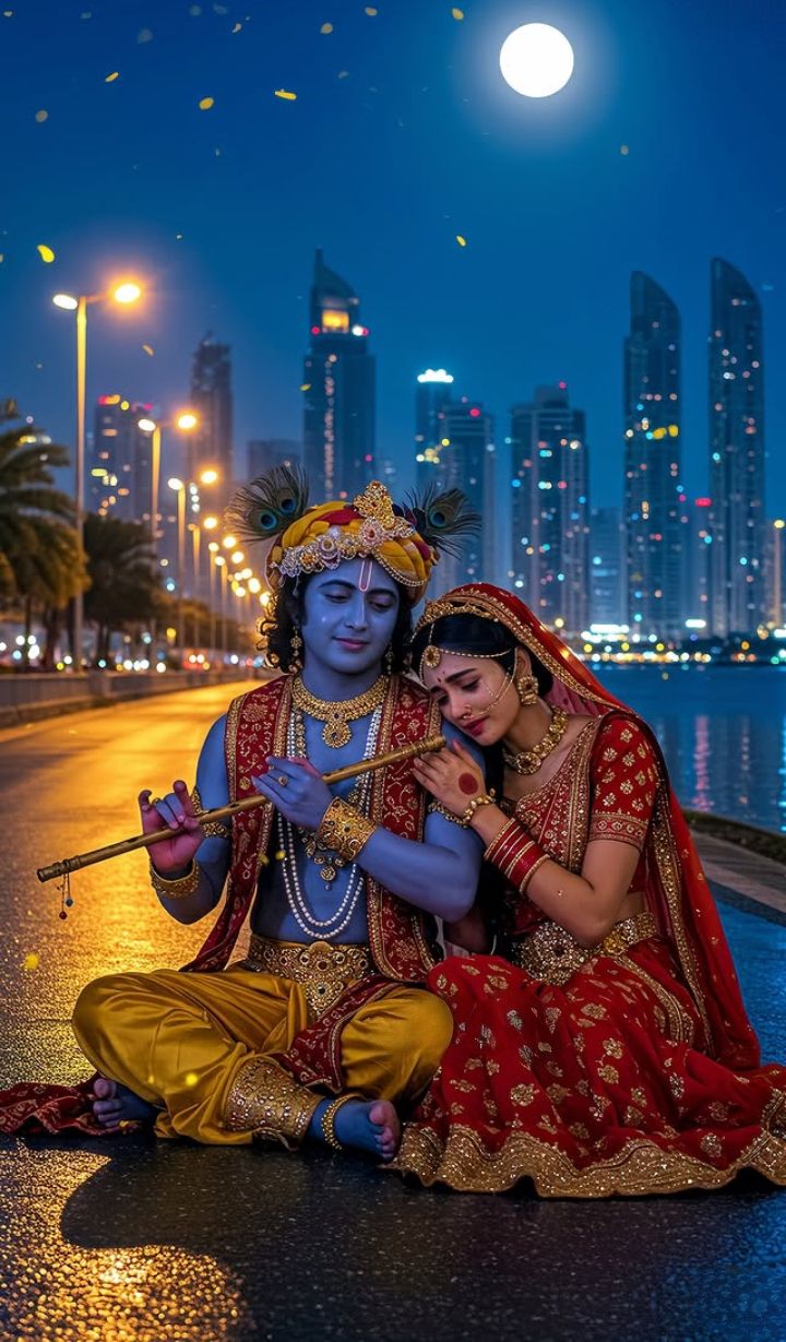 A sense of profound peace emanates from this image of Kanhaiya and Radha. It\'s a beautiful sight—the divine couple, amidst a modern cityscape, completely lost in their leela. See how lovingly Radha rests her head on the shoulder of Murli Manohar, as he serenades her with the sweet notes of his flute? You can almost hear the melodies echoing through the night, filling your heart with bhakti. May this divine darshan bring a touch of celestial joy to your day! 💖✨🙏