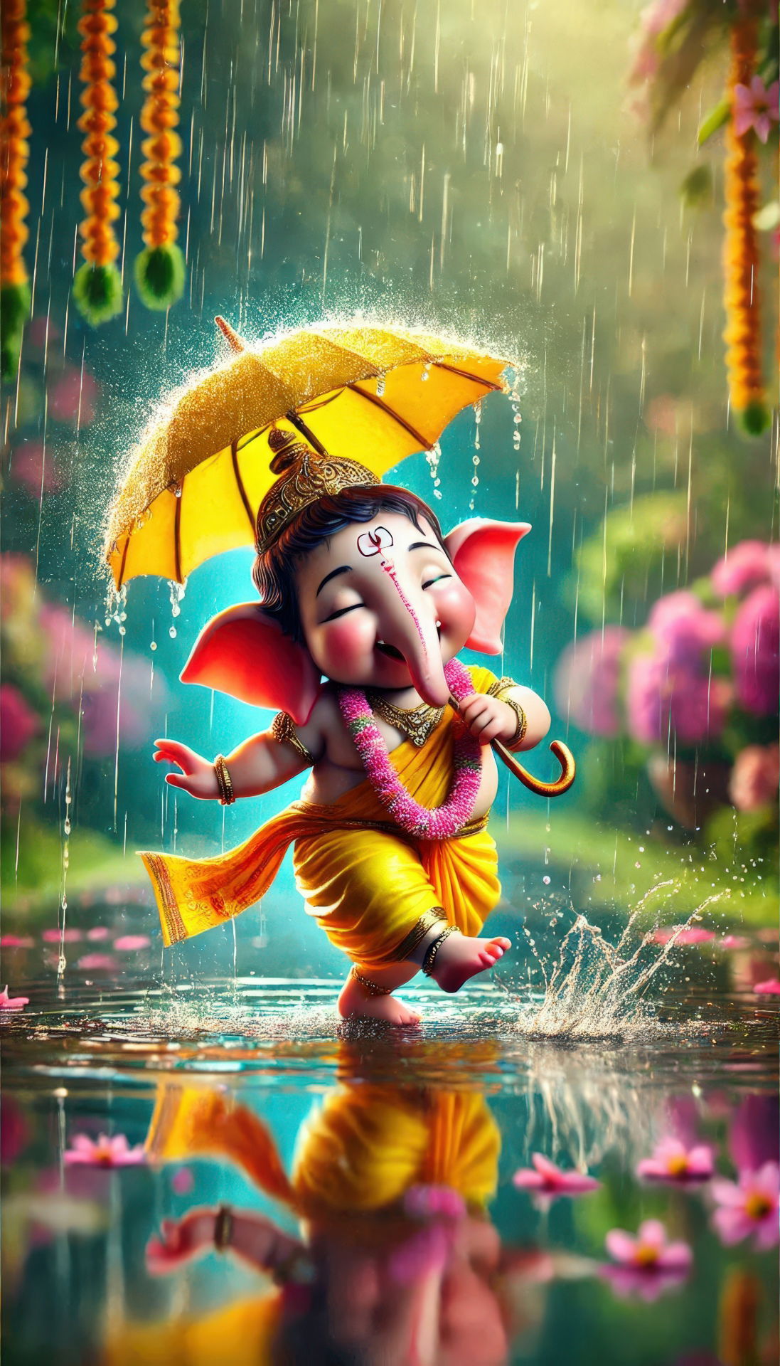 What a delightful sight! Little Ganpati Bappa playfully dances in the monsoon rain, sheltered by a vibrant yellow umbrella. The water splashes around his feet, and the lotus flowers bloom around him, creating a truly magical scene. This image is a reminder of the joy and blessings that Lord Ganesha brings into your life. May this darshan fill your day with positivity and *shakti*! 🕉️🌸✨ Make your phone a window to divine moments with this image.