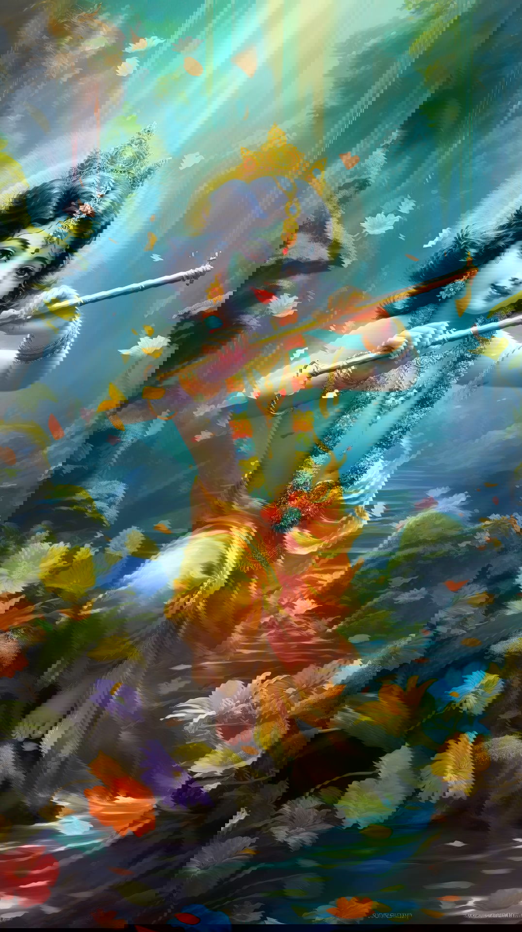 A sense of profound peace emanates from this captivating image of Kanhaiya, lost in the melodies of his flute. The gentle curve of his flute, coupled with the vibrant flowers surrounding him, creates a scene of pure bliss. Bal Krishna’s playful smile and divine aura will surely brighten your day and bring a touch of *bhakti* into your life. May this image fill your phone with positive energy and offer daily *darshan*! 🌸✨🙏