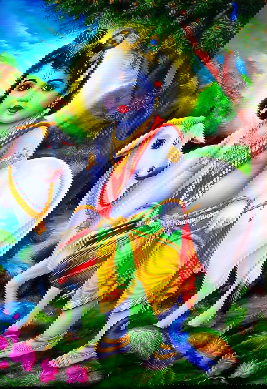 A sense of pure joy radiates from this delightful image of little Kanhaiya, the mischievous Bal Krishna! Look at the twinkle in his eyes as he prepares for his next *leela*. He stands amidst lush greenery, his flute poised to play a melody that enchants all beings. A gentle cow and a majestic peacock keep him company, witnessing his divine playfulness. Allow this adorable *darshan* of Krishna to fill your phone with *bhakti* and bring a smile to your face every day! 🌸🕉️✨
