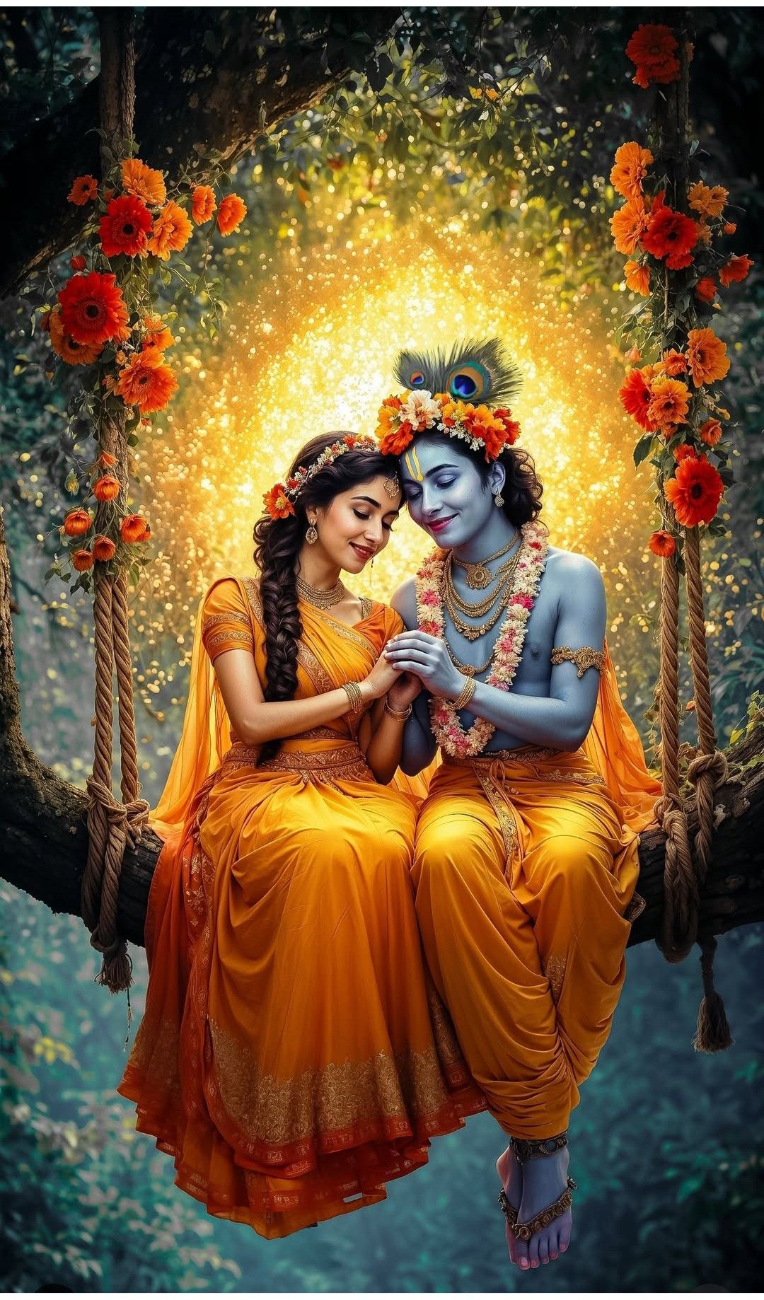 What a breathtaking sight! Lord Kanhaiya and Radha Rani share a tender moment on a beautifully adorned swing, surrounded by a cascade of vibrant orange flowers. The golden light seems to embrace them, enhancing the *bhakti* and love radiating from this divine couple. It\'s a scene straight out of Vrindavan, filled with the sweetest *leela* of the divine pair. Imagine having this auspicious image as your phone\'s wallpaper, bringing *darshan* and blessings to you daily! πΈβ¨π