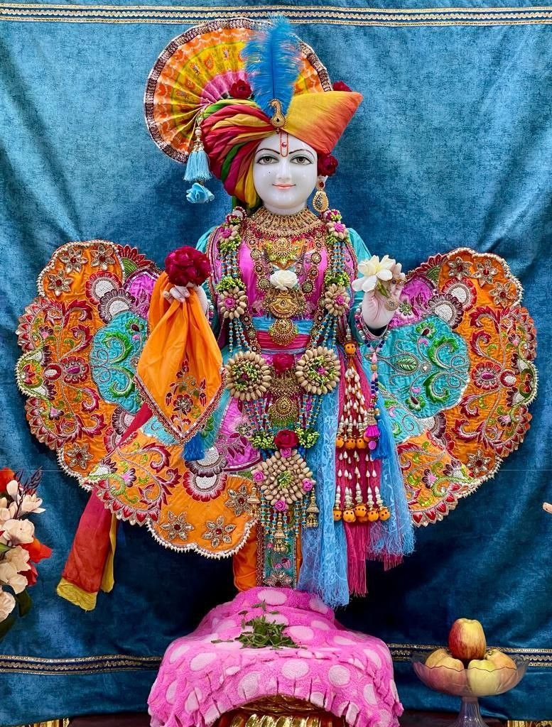 What a captivating darshan of Shri Swaminarayan! The intricate details of his attire, from the vibrant orange turban adorned with a peacock feather to the exquisitely embroidered vest, are simply mesmerizing. ✨ You can almost feel the divine energy radiating from this beautiful murti. The lush floral backdrop and delicate jewelry add to the overall splendor, reminding us of the devotion and love that surrounds Bhagwan Swaminarayan.🙏 May this image bring peace and bhakti to your heart and make your phone a constant source of spiritual upliftment!💖