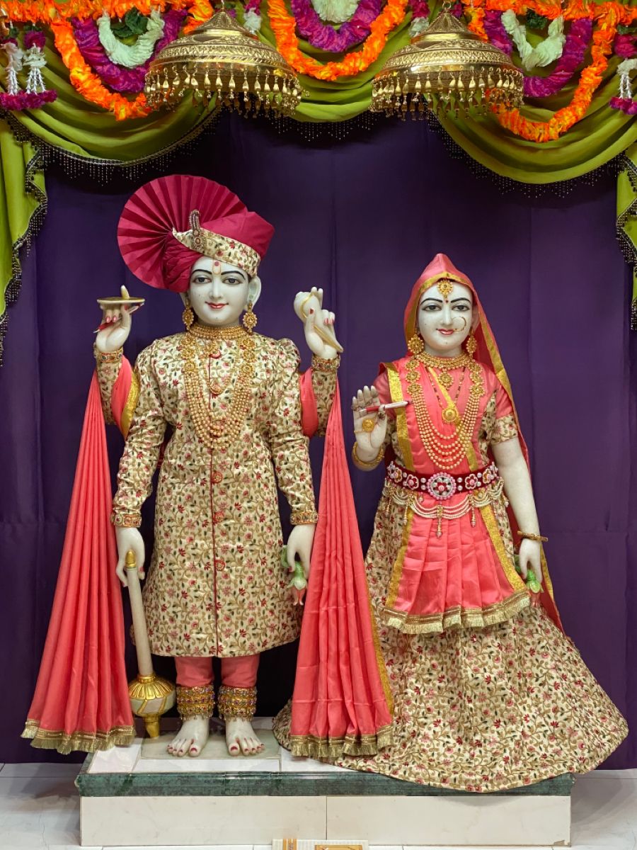What a beautiful sight! This image showcases the divine presence of Swaminarayan and his consort, adorned with exquisite garments and glowing with an inner peace. The intricate details of their attire and the vibrant marigold garlands truly capture the essence of bhakti and devotion. It’s a reminder of the grace and blessings that Swaminarayan bestows upon all his devotees. May this image bring a sense of tranquility and spiritual upliftment to your phone. 🙏🌸✨