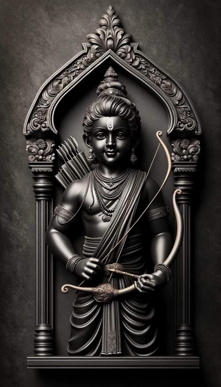 What a striking portrayal of Shree Ram! This image captures a regal and determined Ram, complete with his iconic *dhanush* and arrow. The intricate details and monochromatic palette give it a classic, almost timeless feel, *yaar*. It’s like a glimpse into a valiant past, reminding us of the strength and *dharma* he embodies. You can almost feel the power radiating from this divine warrior. May this image bring peace and devotion to your daily *darshan*. 🕉️✨🙏