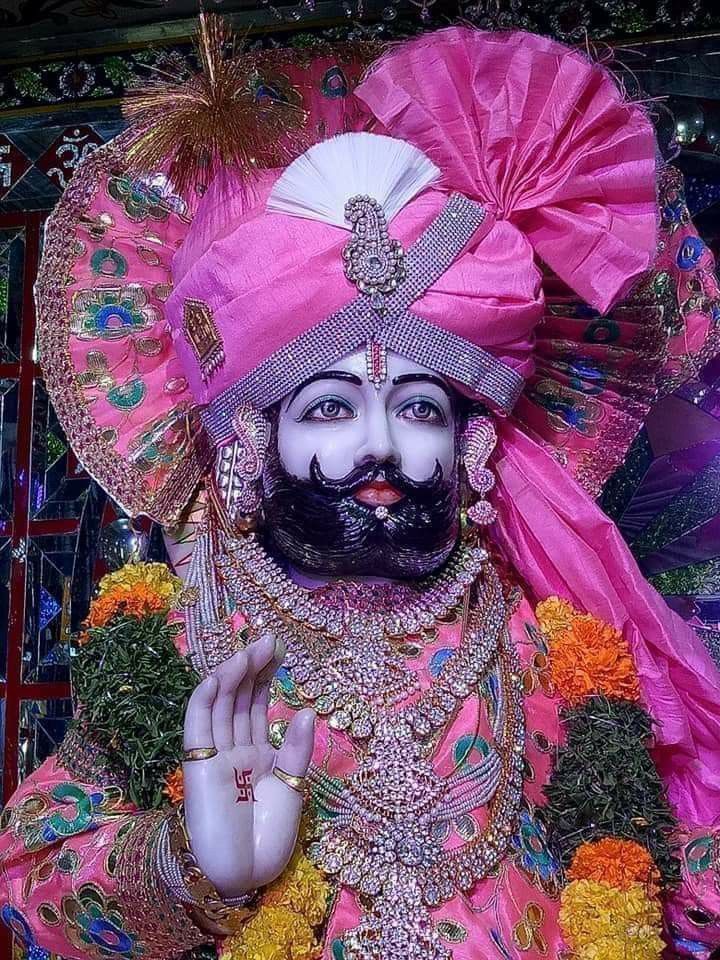 What stories do the eyes of Ramdevpir tell? This image captures the regal presence of Baba Ramdevpir, adorned in magnificent attire, a testament to his revered status. His iconic moustache and ornate headgear are truly captivating, *yaar*. The vibrant colors and intricate details evoke a sense of deep *bhakti* and devotion. May this image bring peace and blessings to your phone, making your day filled with divine *darshan*! 🕉️🙏🌸