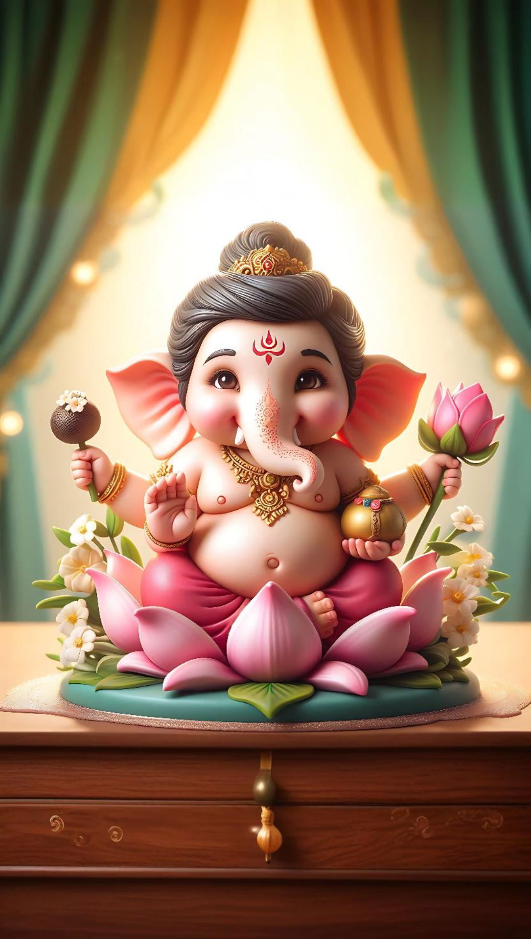 What a delightful sight! This image showcases the beloved Ganpati Bappa, radiating sweetness and charm. Look at those rosy cheeks and that playful twinkle in his eyes! He\'s seated regally upon a lotus, offering a modak with a gentle smile. May this darshan bring blessings and shakti into your life. Let Ganesha\'s wisdom guide you, and may his presence fill your phone with positivity and devotion. 🙏💐✨