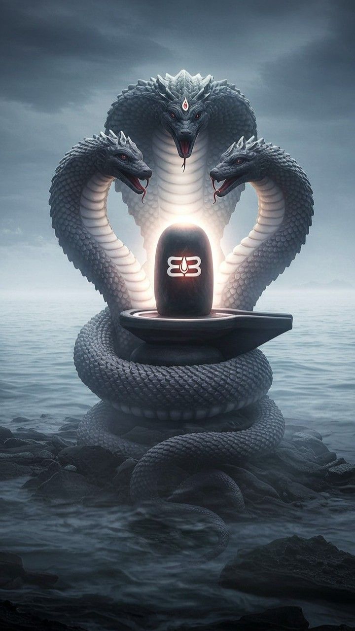 What stories does the mesmerizing gaze of this magnificent serpent tell? This image portrays the divine power of Mahadev, encircled by Vasuki, the serpent king. The sacred Shivling stands as a symbol of creation and dissolution, radiating an aura of profound energy. Feel the bhakti, and let this powerful image bring a sense of peace and connection to your daily life. May Shiva’s blessings be with you always! 🕉️✨🙏