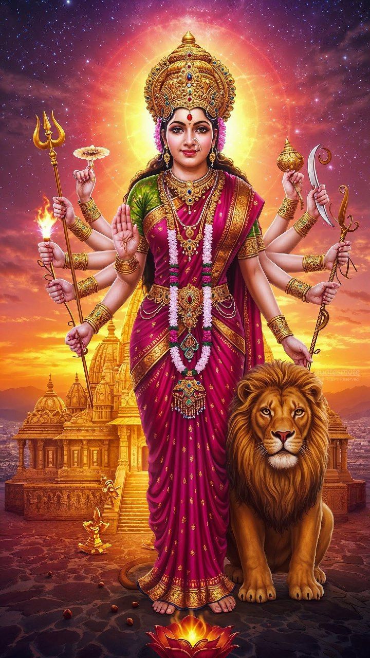 What stories does the fierce grace in Ambe Maa’s eyes tell? This stunning depiction of the divine Mother Durga radiates *shakti* and unwavering strength. The radiant glow surrounding her, coupled with her majestic lion companion, reminds us of her power to overcome all obstacles. Let the blessings of Mataji fill your life with courage and protection. May this image be a source of daily *darshan* on your phone! 🌸✨🙏