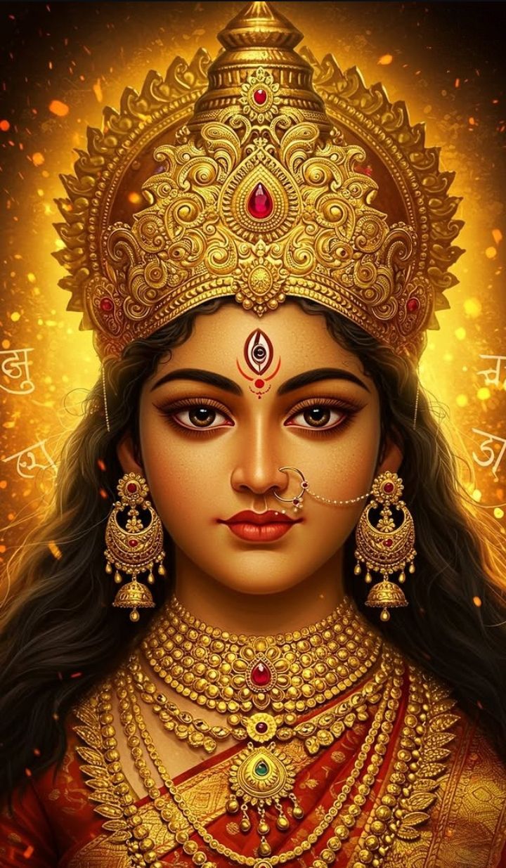 What stories does the intense focus in Devi Parvati\'s eyes tell? ✨ This breathtaking portrait captures the sheer power and grace of Shakti, adorned in dazzling gold jewelry and a magnificent crown. Feel the divine energy radiating from the Mother Goddess as she gazes upon you, offering blessings and protection. Let this image be a constant reminder of her unwavering strength and unconditional love, bringing a moment of peace and *darshan* to your day. 🙏💖🌸