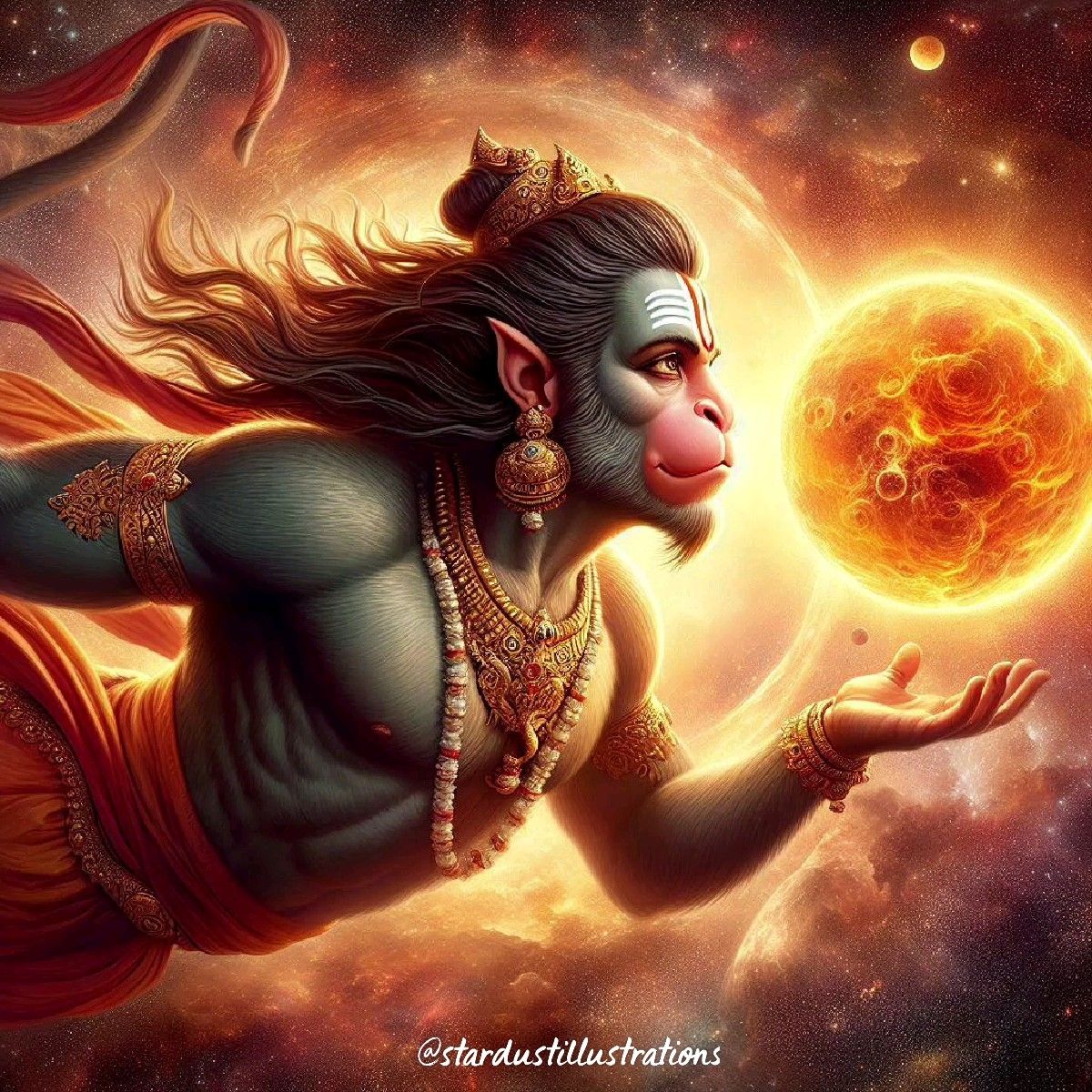 What a stunning sight! Hanumanji, the mighty Pavanputra, reaches out towards the radiant sun, a symbol of devotion and strength. The artist has captured the sheer *shakti* of Bajrangbali with incredible detail – look at the intricate jewelry and the celestial backdrop! This image is a beautiful reminder of Hanuman\'s unwavering loyalty and power. May this *darshan* bring you peace and inspiration every day! 🙏☀️✨